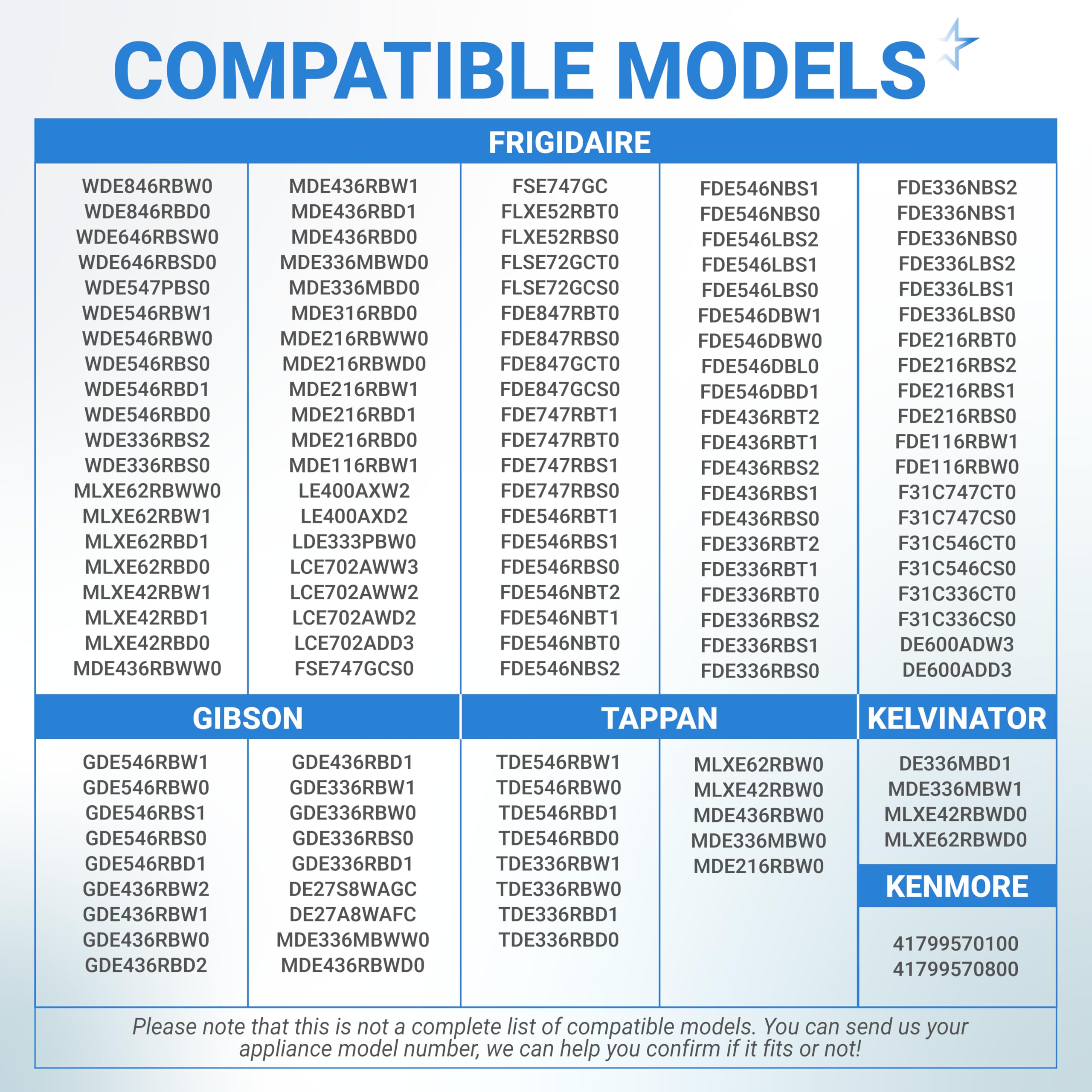FIT MODELS: [Kenmore] - 41799570100, 41799570800. [Gibson] - DE27A8WAFC, DE27S8WAGC, GDE336RBD1, GDE436RBD1, GDE546RBS1, GDE546RBW0, GDE546RBW1, etc. [Frigidaire] - DE600ADD3, F31C336CS0, F31C546CT0, FDE216RBS0, FDE336NBS0, FDE436RBS0, FLSE72GCT0, FSE747GC, MDE316RBD0, MDE436RBD1, etc.