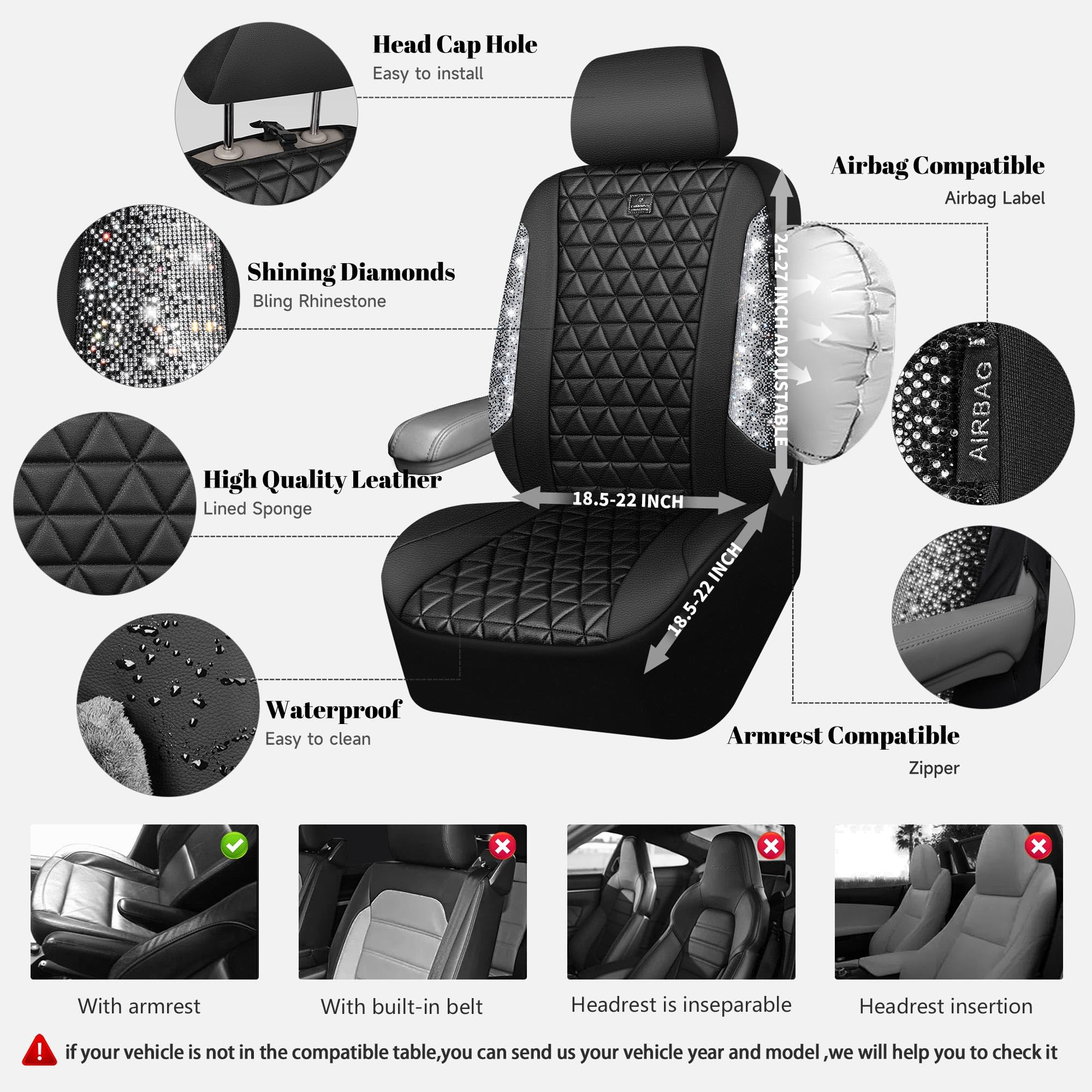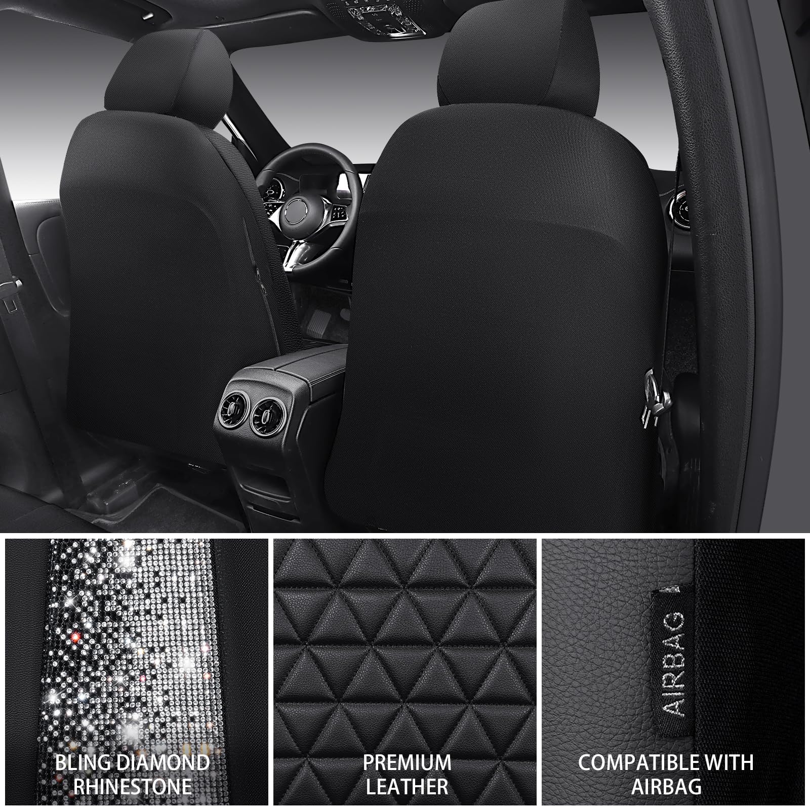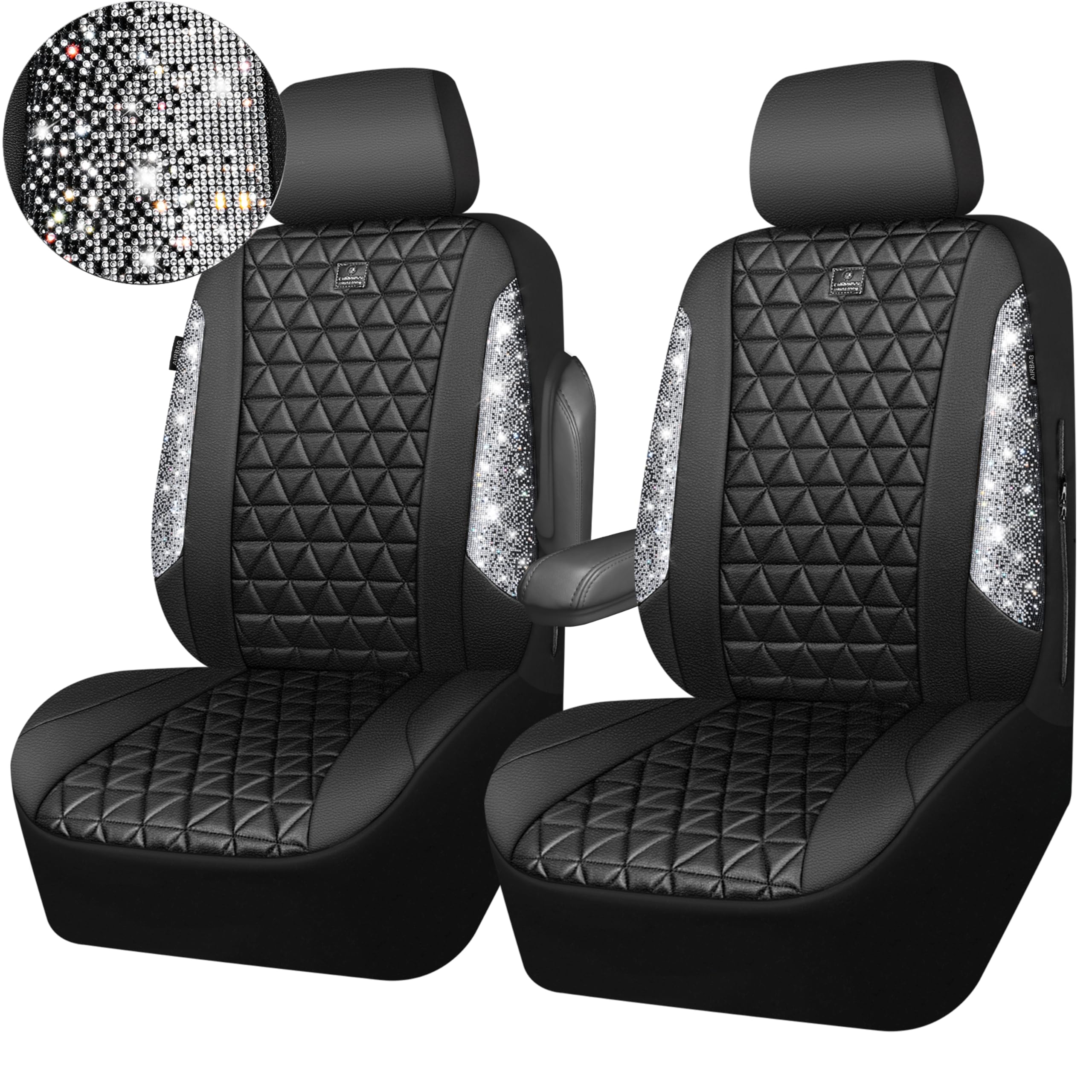 UNIVERSAL SPARKLY DIAMOND - Refresh your car if you install the bing bling crystal diamond leather seat covers, water resistant material. Surface rhombic texture design lined sponge soft and comfortable. Fit for most SUV Sedan Pickup coupe automobile vehicle seats with adjustable headrests. Can be installed with the detachable headrests. Easy to install, with installation manual, can be installed in 10 minutes