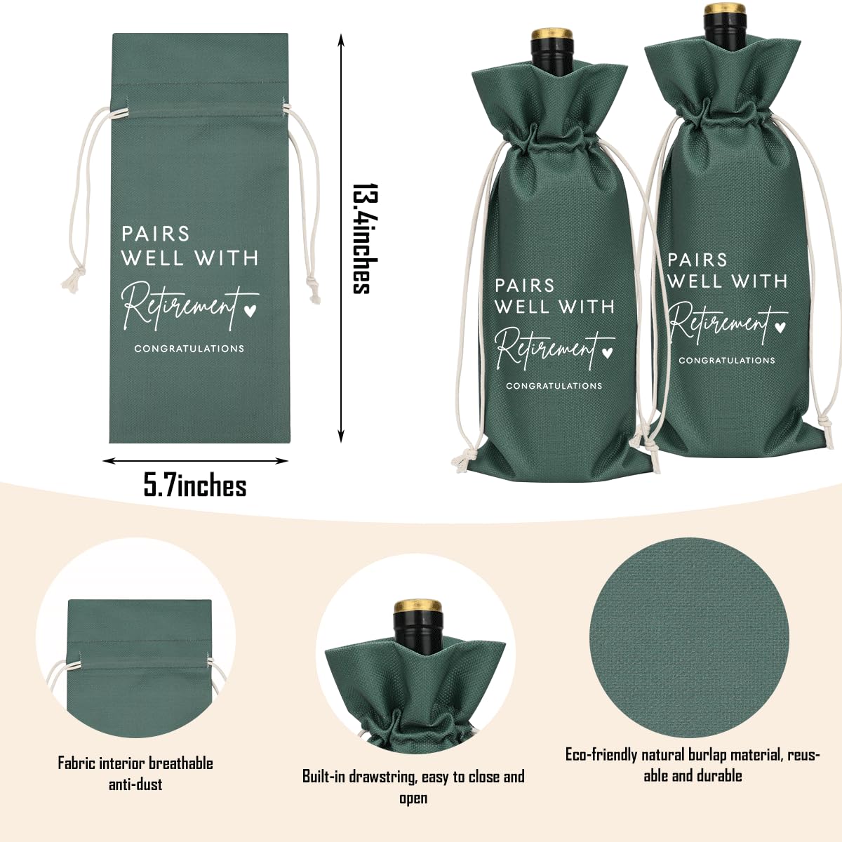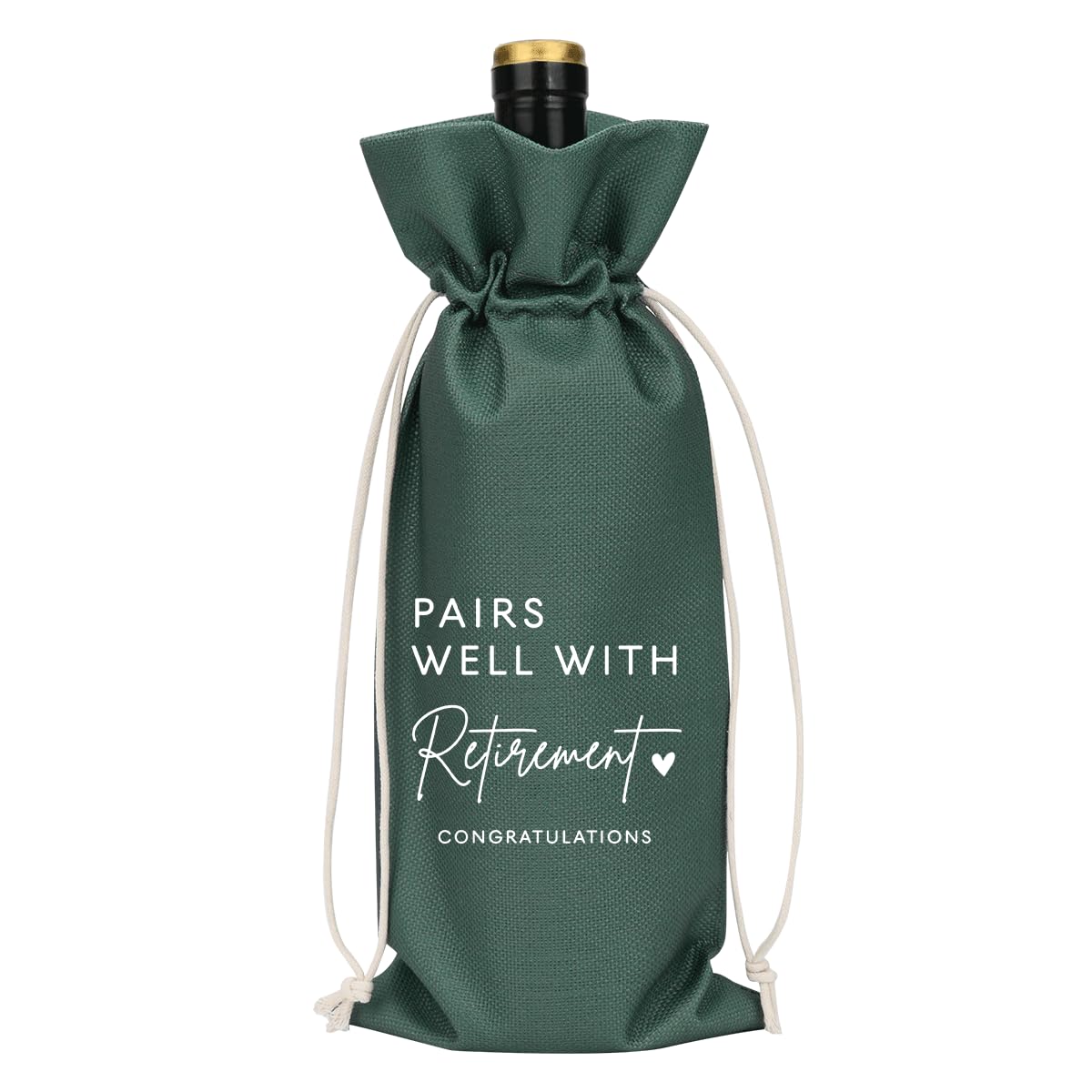 【Wine Bag With Drawstring Setup】Our retirement wine bag is made from high-quality burlap, measures 5.6'' x 12.9'', and features a drawstring design that makes it very easy to open and close. But Just be mindful of the size of the bottle you choose! A "regular" sized wine bottle would be the best choice to fill the bag. Be suitable for most regular sized 750ml single wine, champagne. Adding a bottle of wine is a great gift!