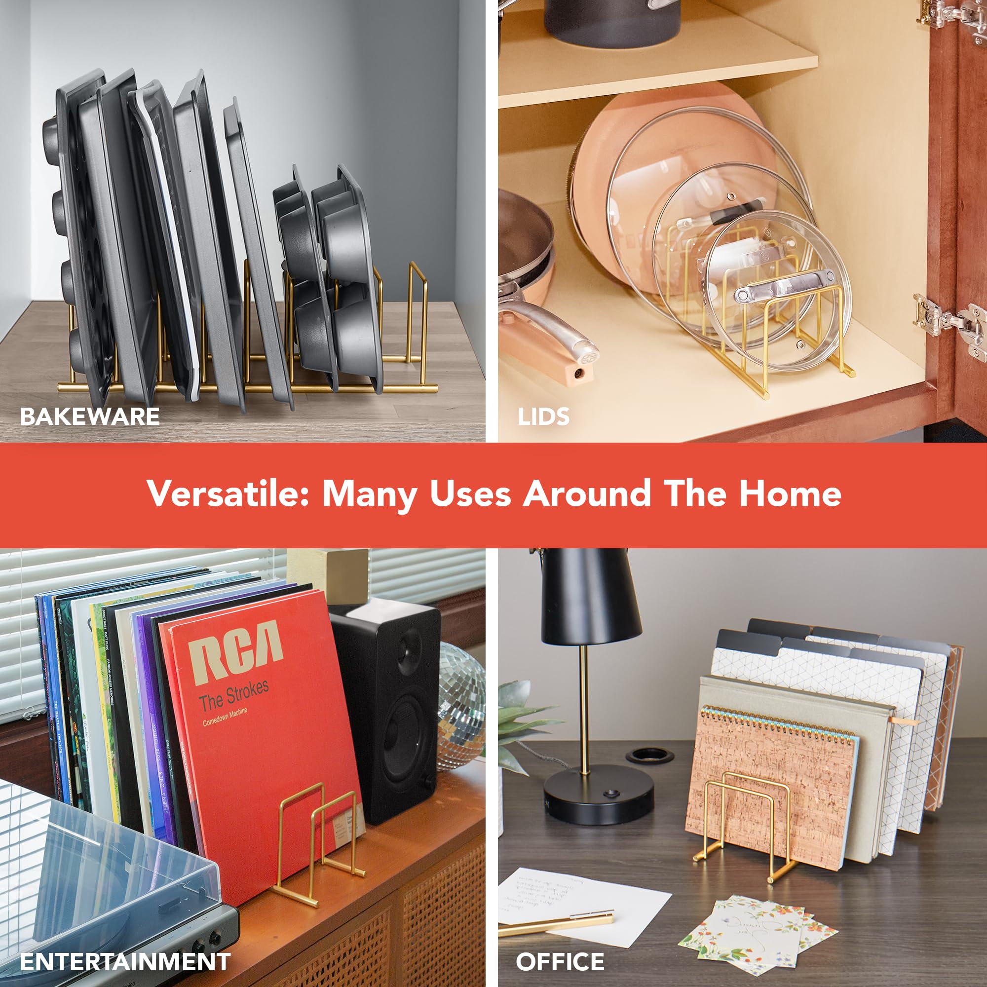 Make kitchen organization effortless with the Spectrum Euro Cutting Board Holder Stand a versatile rack that turns jumbled cutting boards and scattered bakeware into an organized system you'll love using. Eight separate compartments designed to securely store plates and chopping blocks keep everything visible and accessible eliminating the daily frustration of unstacking items. Quality shows in every detail from the solid steel construction to the gleaming Gold finish of this cutting board holder. This isn't flimsy wire but substantial steel that supports heavy cast iron griddles and thick cutting boards without bending. Use it beside the sink as a cutting board drying rack or inside cabinets to double your vertical storage. The sophisticated finish resists fingerprints and wipes clean easily maintaining its polished look. At just 4.5 inches deep this space saving design works anywhere you need it. Create a cutting board rack for countertop storage near your prep area or use it as a cutting board organizer for cabinet installation. The standard sizing fits most kitchen spaces while the vertical orientation maximizes every inch. Trust Spectrum's three decades of experience to deliver organization that works as hard as you do.