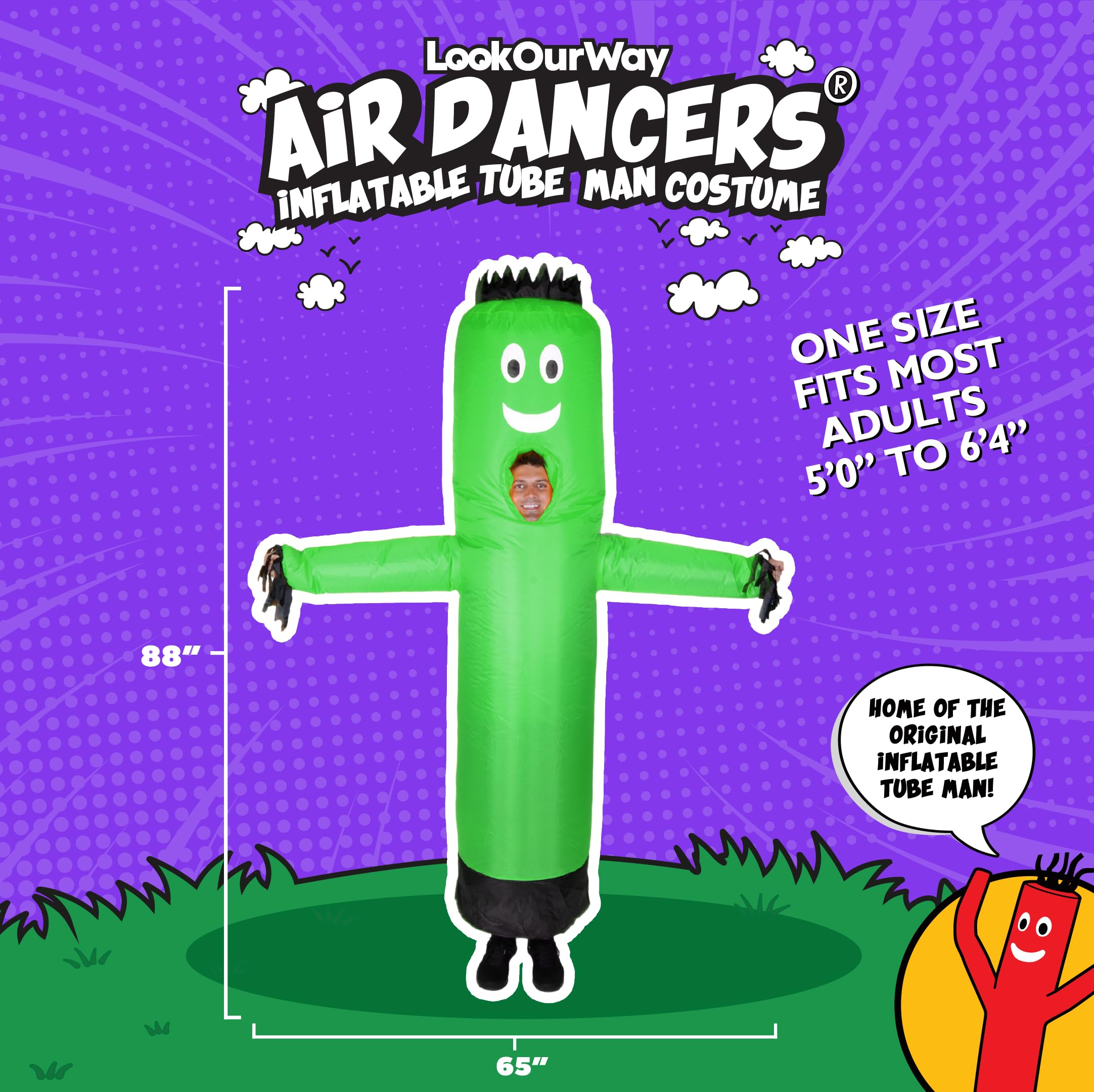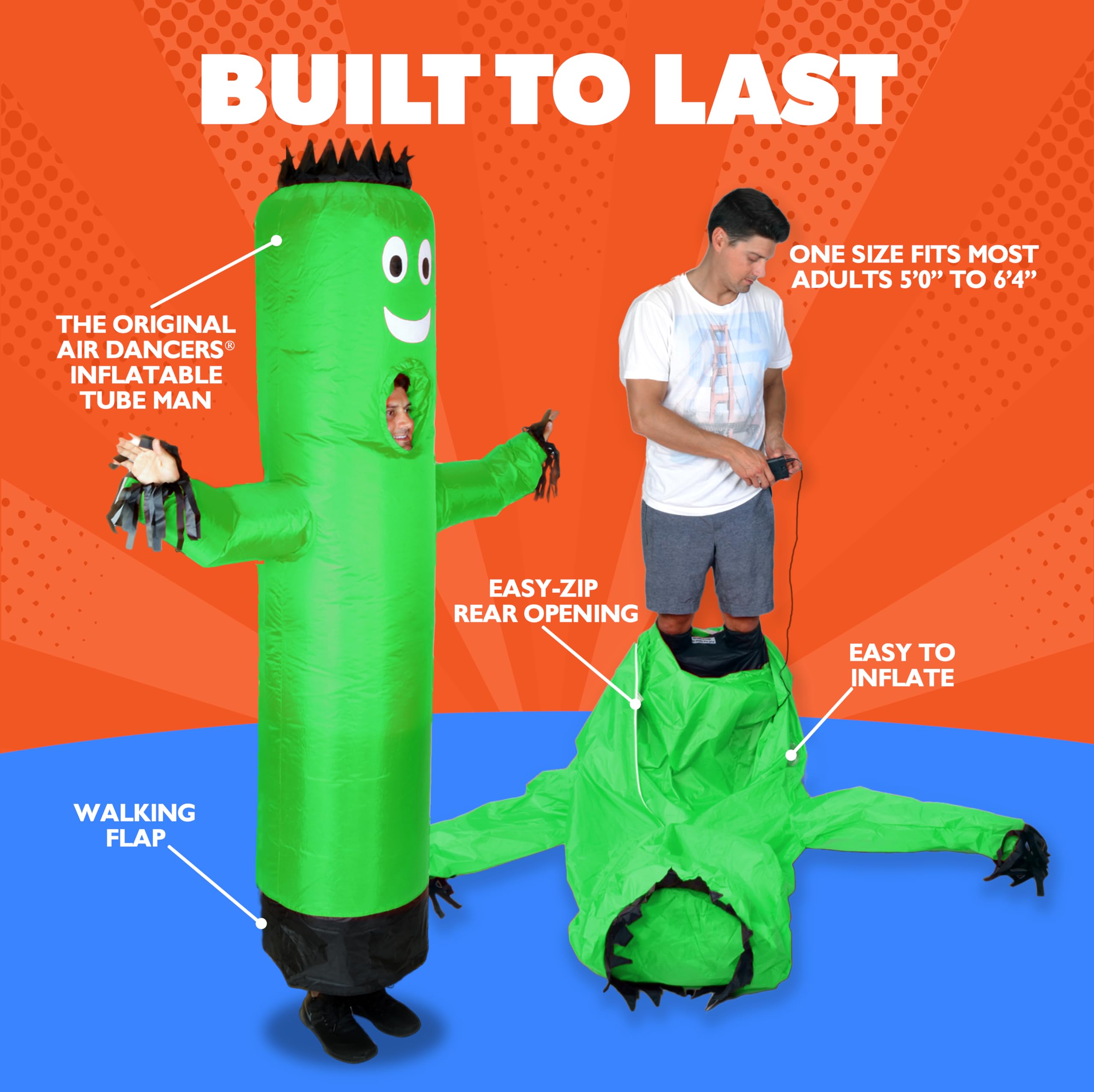 Inflatable Costume with Iconic Wavy Arms: Designed after the classic Air Dancers, this adult inflatable costume features flailing arms, a wacky face, and vibrant colors—ideal for halloween costumes inflatable searches.