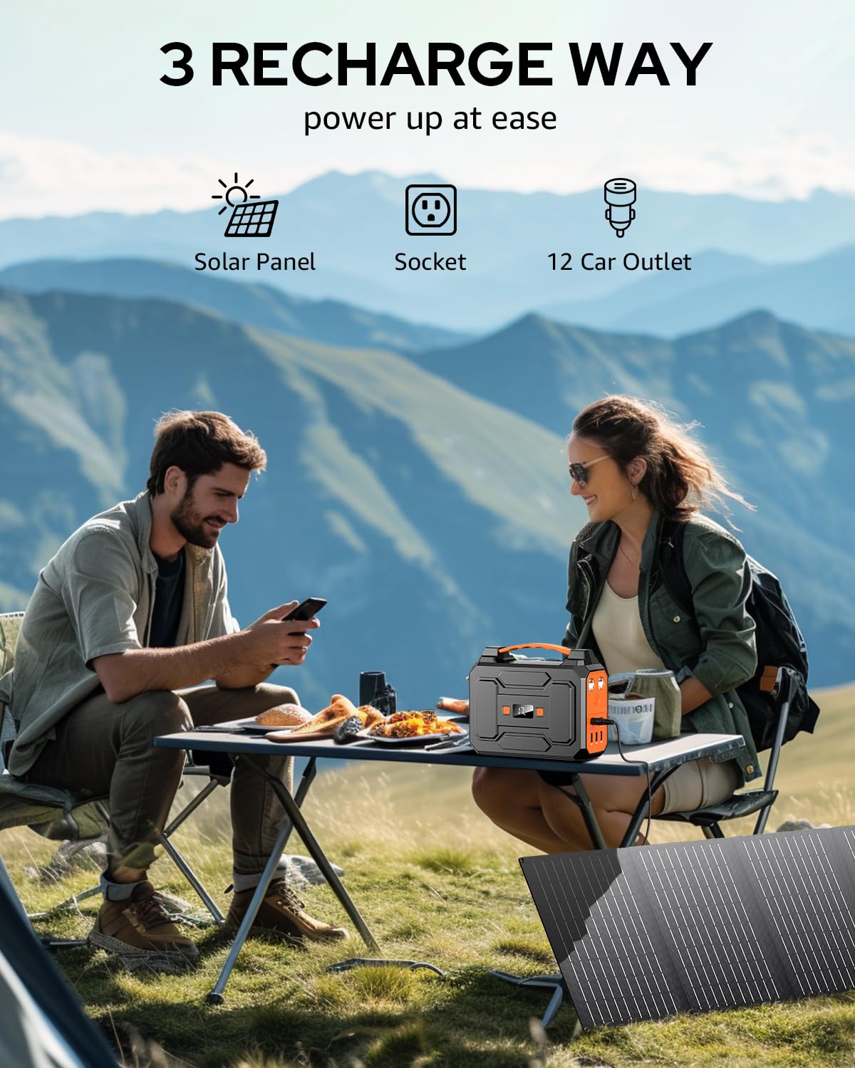 PORTABLE POWER STATION WITH LARGE CAPACITY: This portable power station with solar panel 146Wh/39600mAh is powerful enough to charge your devices like laptops, phones, tablets, cameras, drones, fans, in-car appliances. Portable Power Station weights only 3.3lb, fits perfectly in backpack or suitcase, making it a great portable power station for camping, hurricanes, emergency, home and outdoor activities.