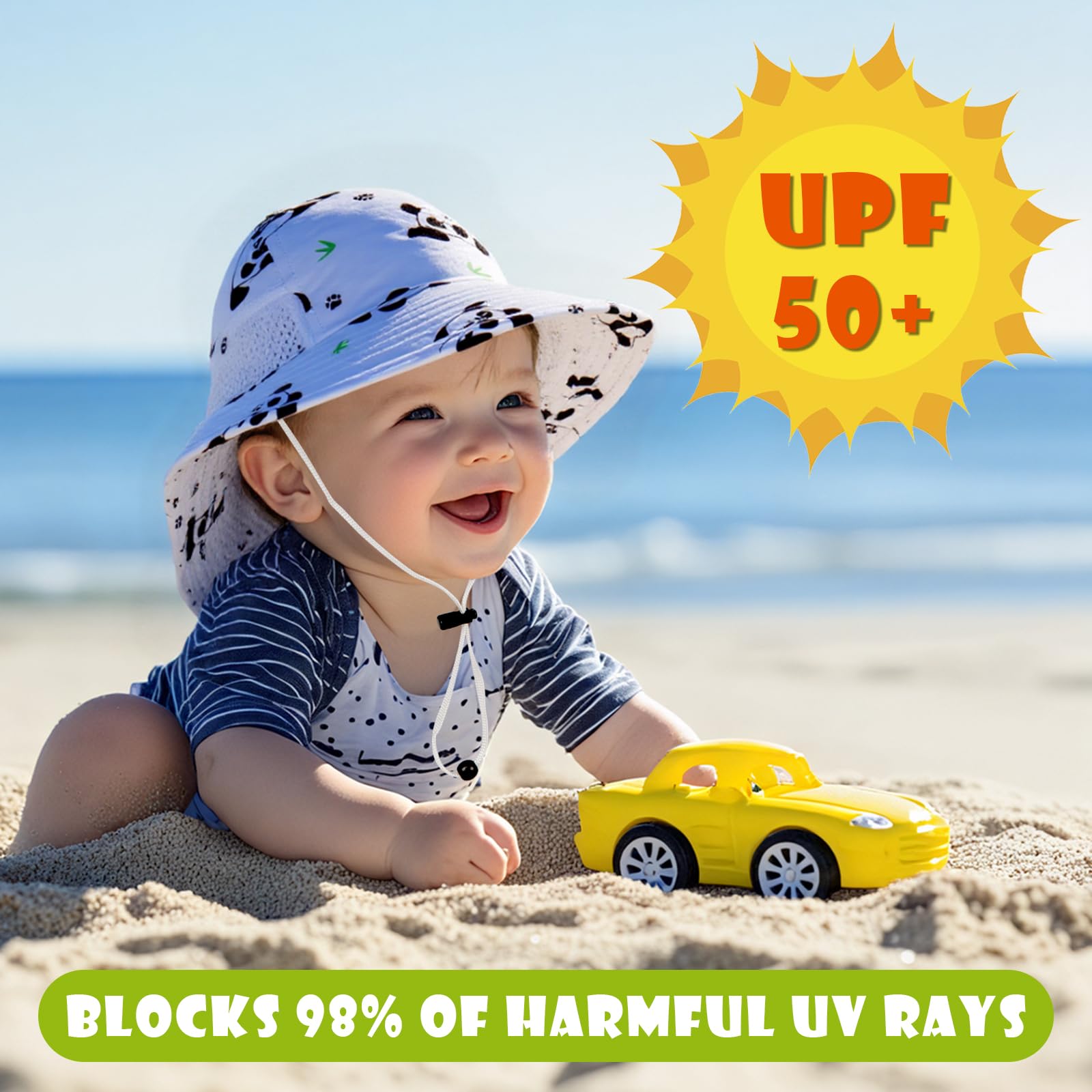 PREMIUM MATERIAL: The toddler sun hat made of high quality polyester fabric with UPF 50+ UV sun protection. Soft, quick-drying, breathable baby sun hat keeps baby cool and comfortable during the hot outdoor. The 2-piece in package is more economical and practical, convenient for your child to wash frequently and to match for different clothes