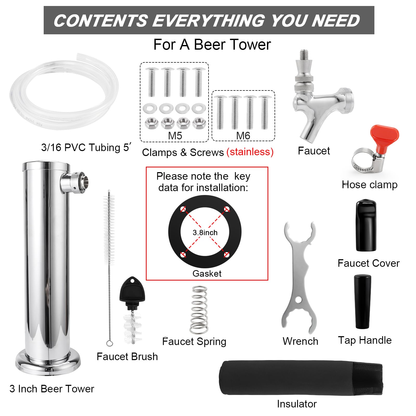 Contents Everything You Need For A kegerator parts tower: Comes with stainless steel column, All stainless steel beer faucet, 5 feet 3/16" I.D. tubing, beer tower gasket, M5 screws & nuts of 4, clamp, beer faucet spring, beer faucet soother, beer tap wrench, and 1 cleaning brush. A complete draft beer dispenser tower