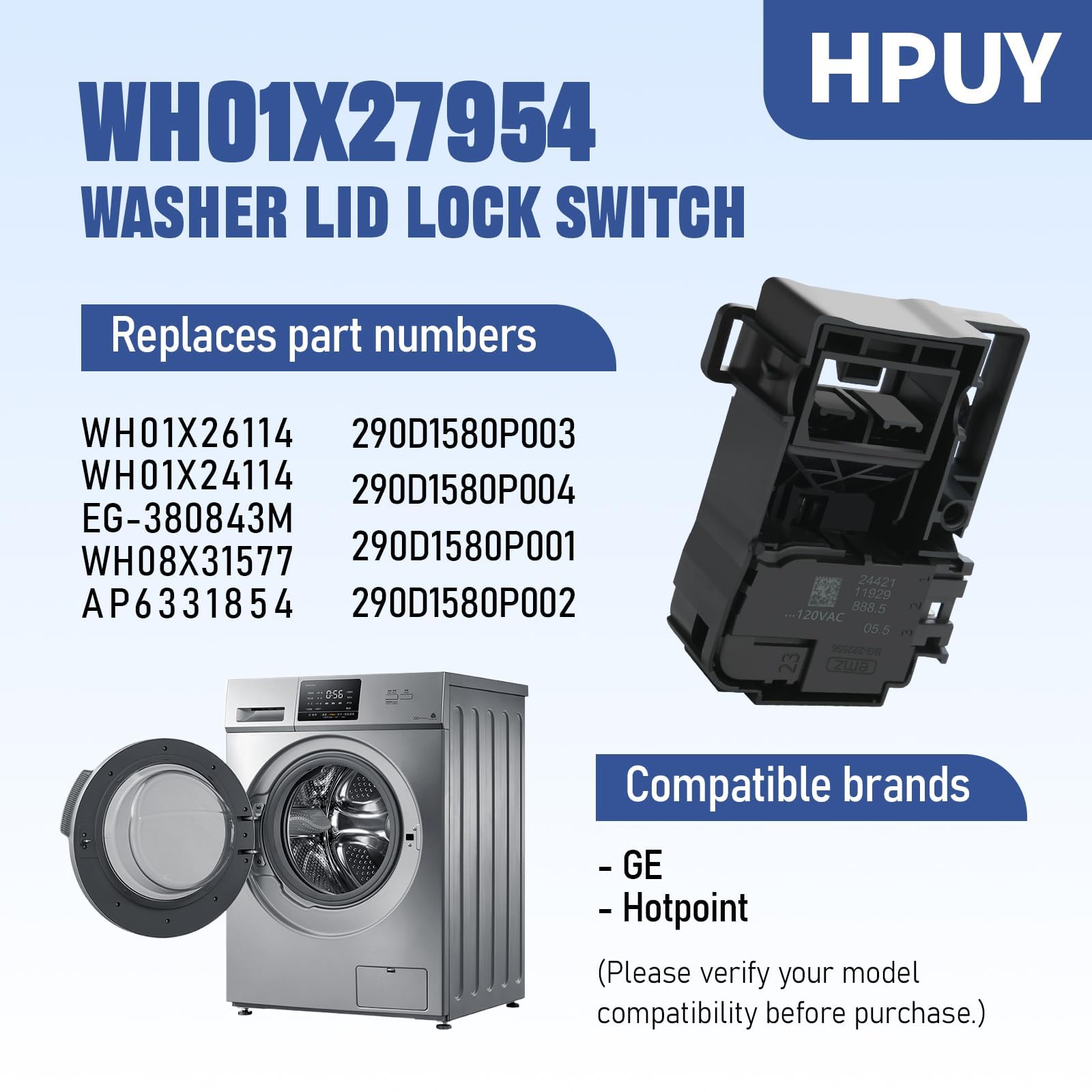 Perfect Replacement: HPUY WH01X27954 Washer Lid Lock Switch is a perfect replacement for part numbers WH01X26114, WH01X24114, WH08X31577, AP6331854, EG-380843M, 290D1580P001, 290D1580P002, 290D1580P003 and 290D1580P004. Compatible with GE and Hotpoint top-load washers