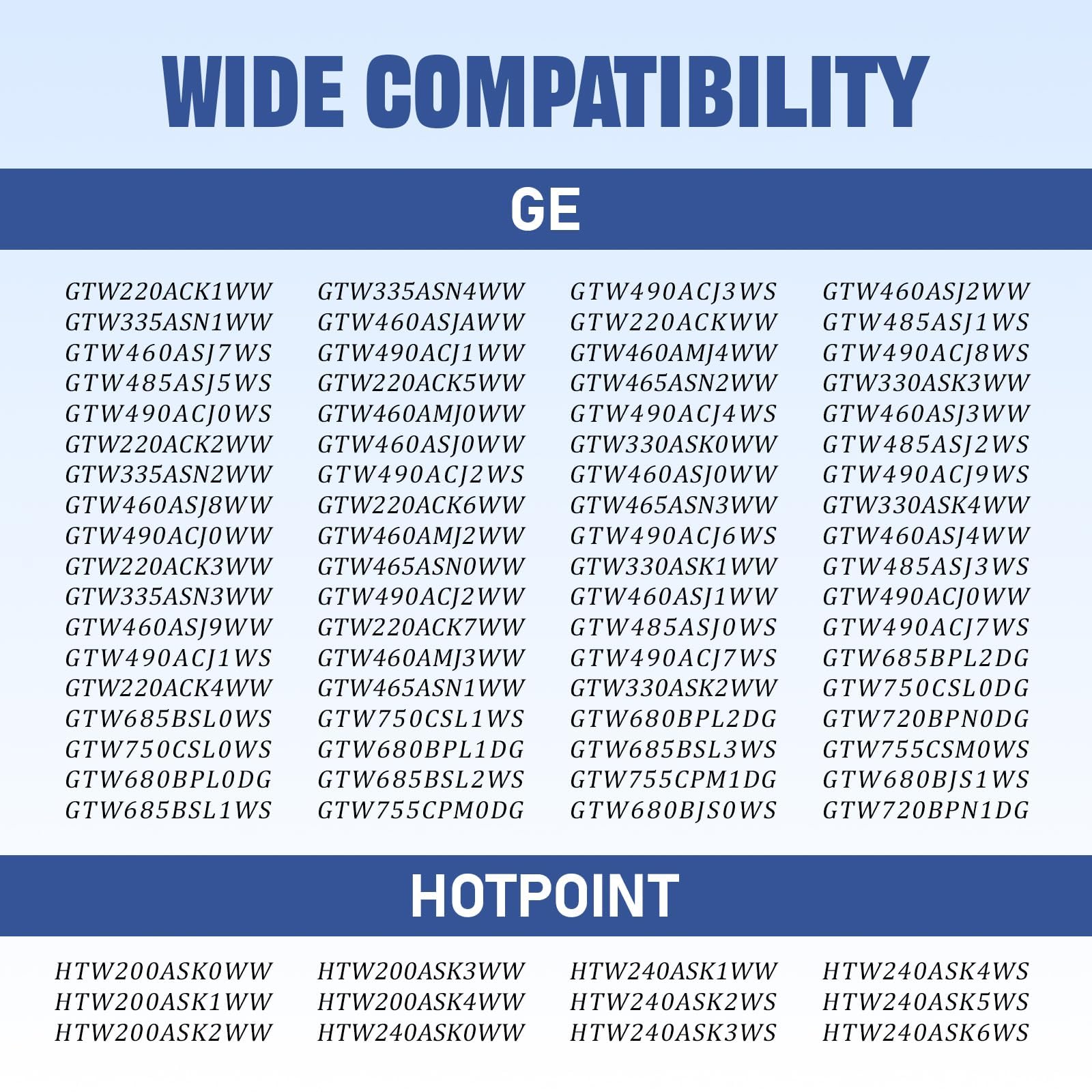 Wide Compatibility: Designed to fit a range of GE Hotpoint washers including models such as GTW220ACK1WW GTW220ACK2WW GTW220ACK3WW GTW220ACK4WW GTW220ACK5WW GTW220ACK6WW GTW220ACK7WW GTW220ACKWW GTW330ASK0WW GTW330ASK1WW GTW330ASK2WW GTW330ASK3WW GTW330ASK4WW GTW330ASKWW GTW335ASN0WW GTW335ASN2WW GTW335ASNWW GTW460AMJ0WW GTW460AMJ1WW GTW460AMJ2WW GTW460AMJ3WW GTW460AMJ4WW GTW220ACK4WW GTW220ACK5WW, and more. Ensure your washer model matches our compatible model list for a seamless fit