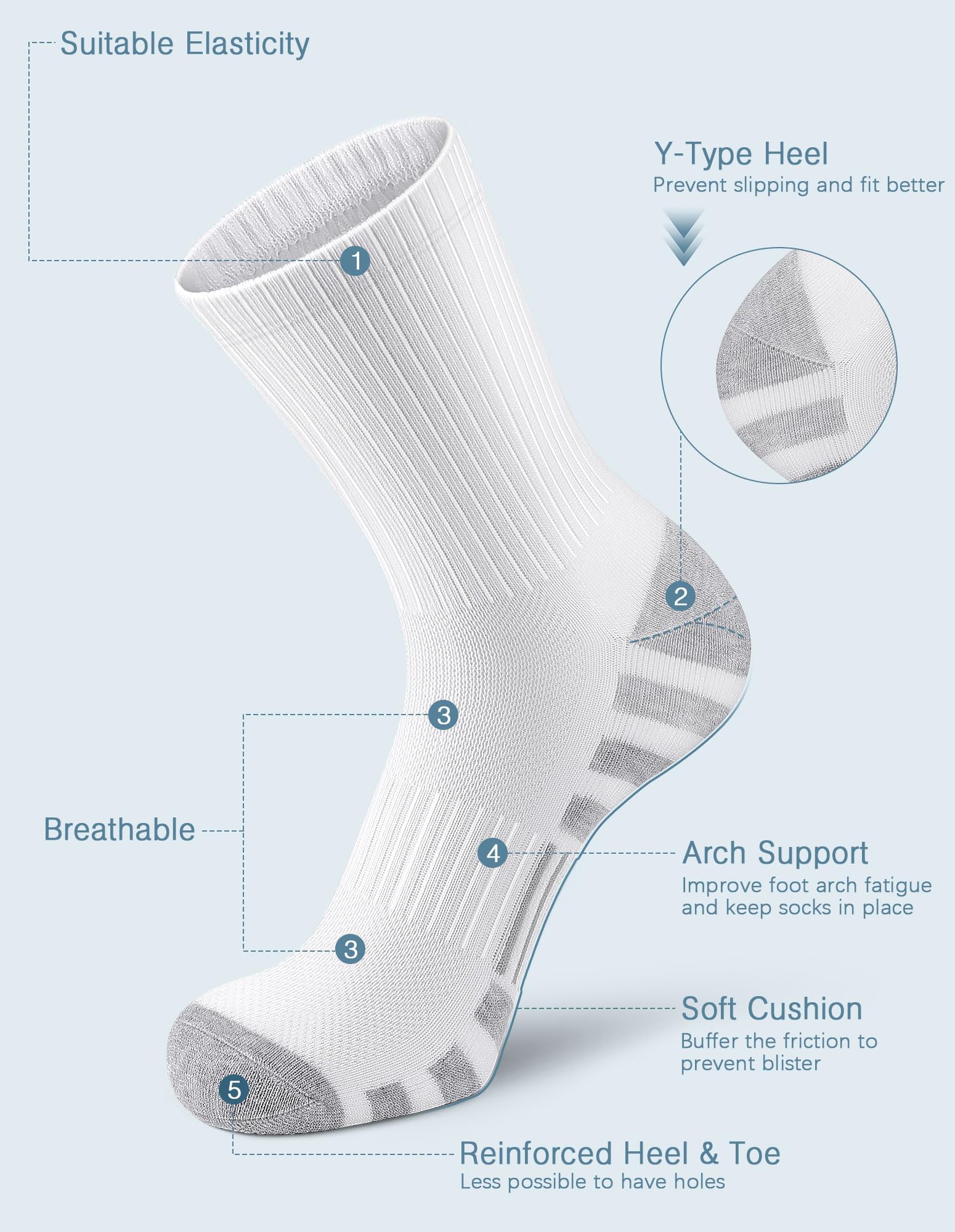 [FULL CUSHIONED SPORT SOCKS]: Crew socks provide better support, constructed with soft plush sole cushioning for extra durability and softness in high-wear areas, reduce the impact on the knee. Elastic arch support and mesh top design are provided with proper compression force, meanwhile, can also keep in good air permeability. Comfortable seamless toe ensures protection against yarn chafing and irritation caused by traditional toe seams.