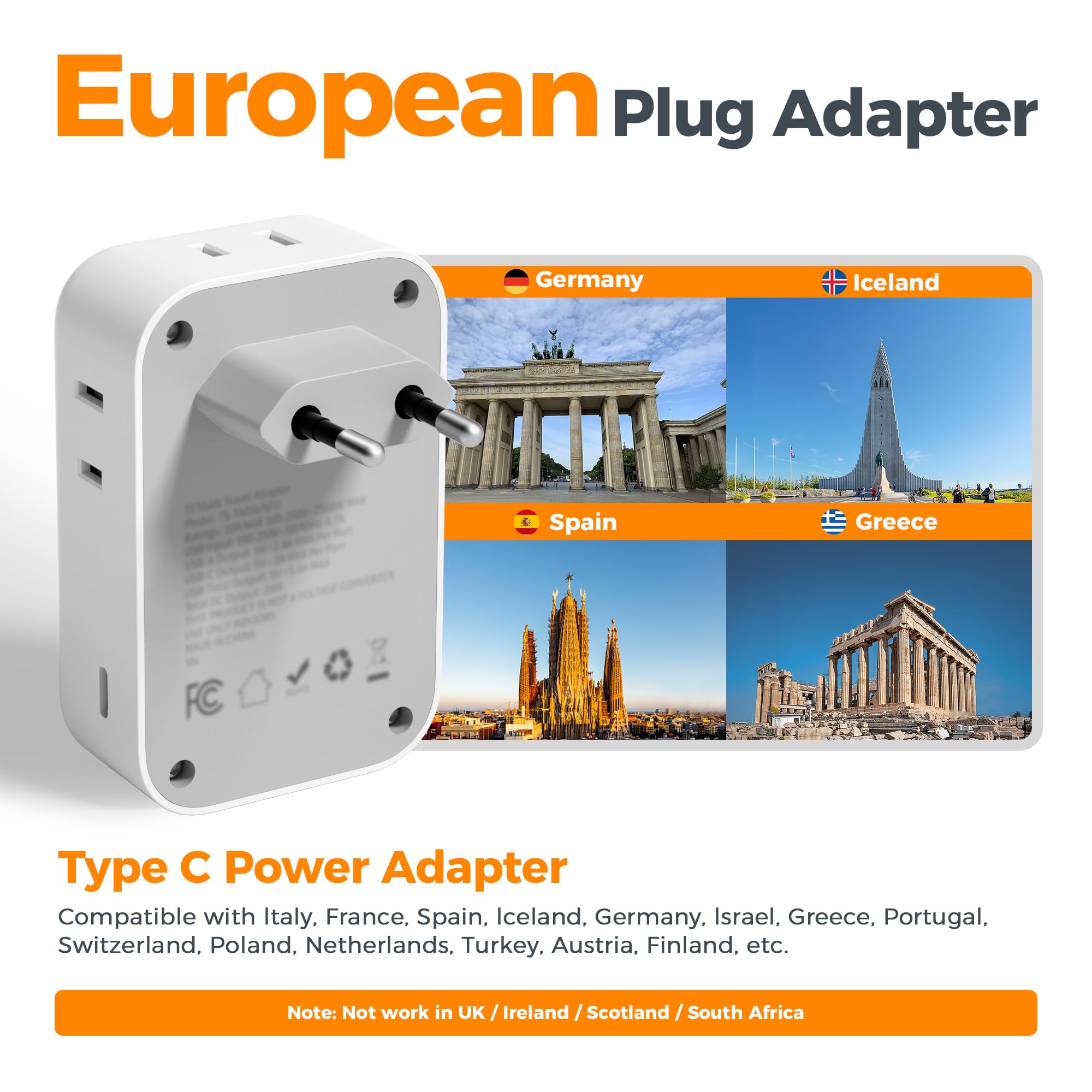 European Plug Adapter: The euro travel adapter compatible in most European countries such as Spain, Italy, France, Germany, Greece, Austria, Belarus, Belgium, Croatia, Denmark, Portugal, Poland, Netherlands, Turkey, etc; Some countries or regions use multiple socket types.(Note: not work in UK/Ireland/Scotland)