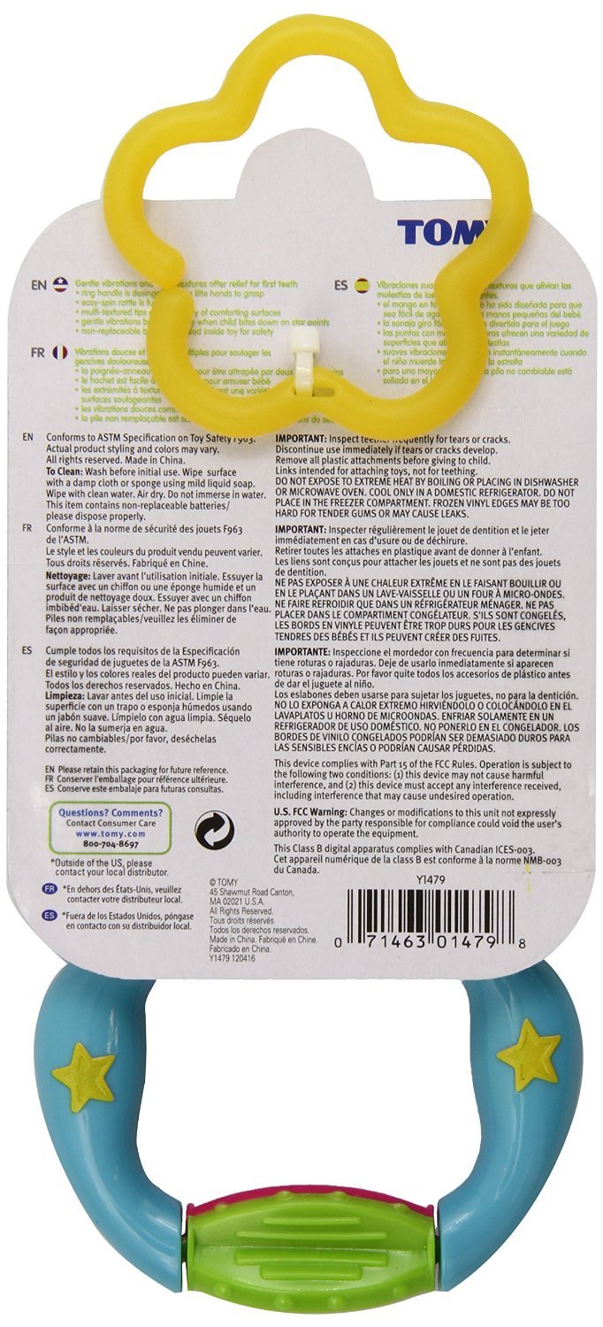 Amazon.com In a relatively new concept in teething, The First Years introduces this massaging action teether. The concept is really quite simple: offer even the youngest infants a means to massage their gums at will. The massaging action increases circulation, thereby helping to alleviate swelling and discomfort. This soft, yellow, star-shaped teether has a smiling face and three nubby points that vibrate when a child bites down on them. The star sits upon an oversized blue plastic handle that's easy for even the youngest child to grasp. There's also an opening at the bottom of the handle that accepts a toy strap. The star rattle is surface washable and is powered by a nonreplaceable battery that's sealed inside the teether's handle for maximum safety. --Tami Horiuchi Product Description This teether will be the "star" of your collection, with chewable star points that produce a safe, soothing vibration whenever baby bites down on them. The massaging action increases circulation, thereby helping to alleviate swelling and discomfort. Powered by a small long-life battery that's sealed inside, this playful teething toy features an easy-grasp ring handle with spin feature for added fun. The star rattle is surface washable. Your teething star will love it! From the Manufacturer Playful and child-friendly, this teether offers a different kind of comfort. The textured chewable star points produce a safe, soothing vibration whenever the child bites down on them. It's powered by a small long-life battery that's sealed inside.