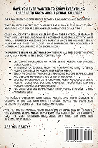 Have you ever wanted to know everything there is to know about serial killers? Ever pondered the differences between psychopaths and sociopaths? Want to know exactly why cannibals eat human flesh? Want to read about the most downright bizarre serial killer motivations of all time? What jobs attract the most serial killers? How many uncaptured murderers are walking our streets right this second? How do female killers differ from males? What deluded maniac killed people because he thought it would stop earthquakes? What movie franchise has inspired the most copycat murders? The Ultimate Serial Killer Trivia Book answers all these questions and much, much more! Featuring obscure serial killer trivia you’ll struggle to find anywhere else. Up-to-date information on active serial killers and ongoing murder cases. 11 distinct categories, from The Psychopathic Mind to Serial Killing Cannibals to Killers Inspired By Media Eerily fascinating trivia pieces regarding famous serial killers and obscure murderers you’ve never heard of. Succinct information on psychopaths, killer kids, occult serial killers, murderous doctors, cannibals, necrophiles and the world’s strangest ever murders. The public’s obsession with serial killers and weird murders is growing by the day, with more TV shows, movies and books now detailing the crimes of these human monsters. There’s no denying that we’re all fascinated by serial murder – it’s part of the human experience. Whether you’re fanatical about true crime or brand new to the genre, The Ultimate Serial Killer Trivia Book has something for everyone. Even the most hardened true crime buff will find some new information here! Are you ready?