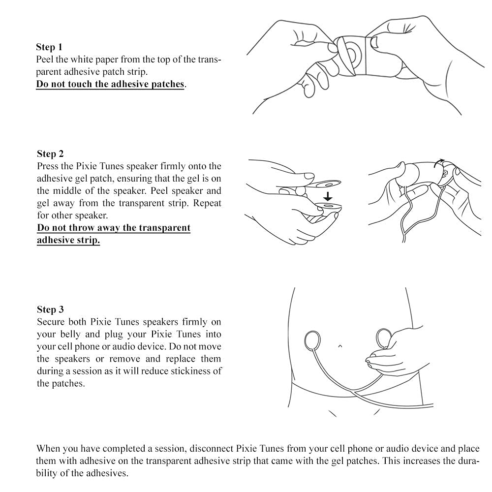 Each pack of Pixie Tunes Replacement Adhesive Pads includes 2 Pairs (4 total) of Silicone Replacement Adhesives perfectly trimmed for your Pixie Tune speakers. The 4 adhesive rings which replace the original ones that came with your Pixie Tunes. Perfectly trimmed to fit both Premium and Elite models, each adhesive replacement pads pair will last approximately 1 month, so this pack will last approximately 2 months. Adhesive replacement pads will not leave residue on skin or stain clothing. Directions for Use 1. Before using Pixie Tunes, gently wipe your skin to remove all lotions and body oil. The adhesive gel patches stick best on fresh cleansed skin. 2. After attaching the adhesive gel patches on the speakers, securely place the speakers on one spot on your belly. Do not move the speakers or remove and replace them during a session as it will reduce the stickiness of the adhesive gel patches. 3. To maintain stickiness of the adhesive gel patches, do not remove them from the speakers after use. Place the speakers with adhesive on the transparent adhesive strip that came with the gel patches. This will prevent the adhesive gel patches from losing its stickiness and prevent dirt buildup. Do not touch the patches or let them come in contact with other surfaces. 4. Over time, as adhesive gel patches come in contact with your skin, body oil will reduce stickiness. If this happens, place a few drops of water on the adhesive patches and rub gently with your fingers. Re-apply after the patch dries.