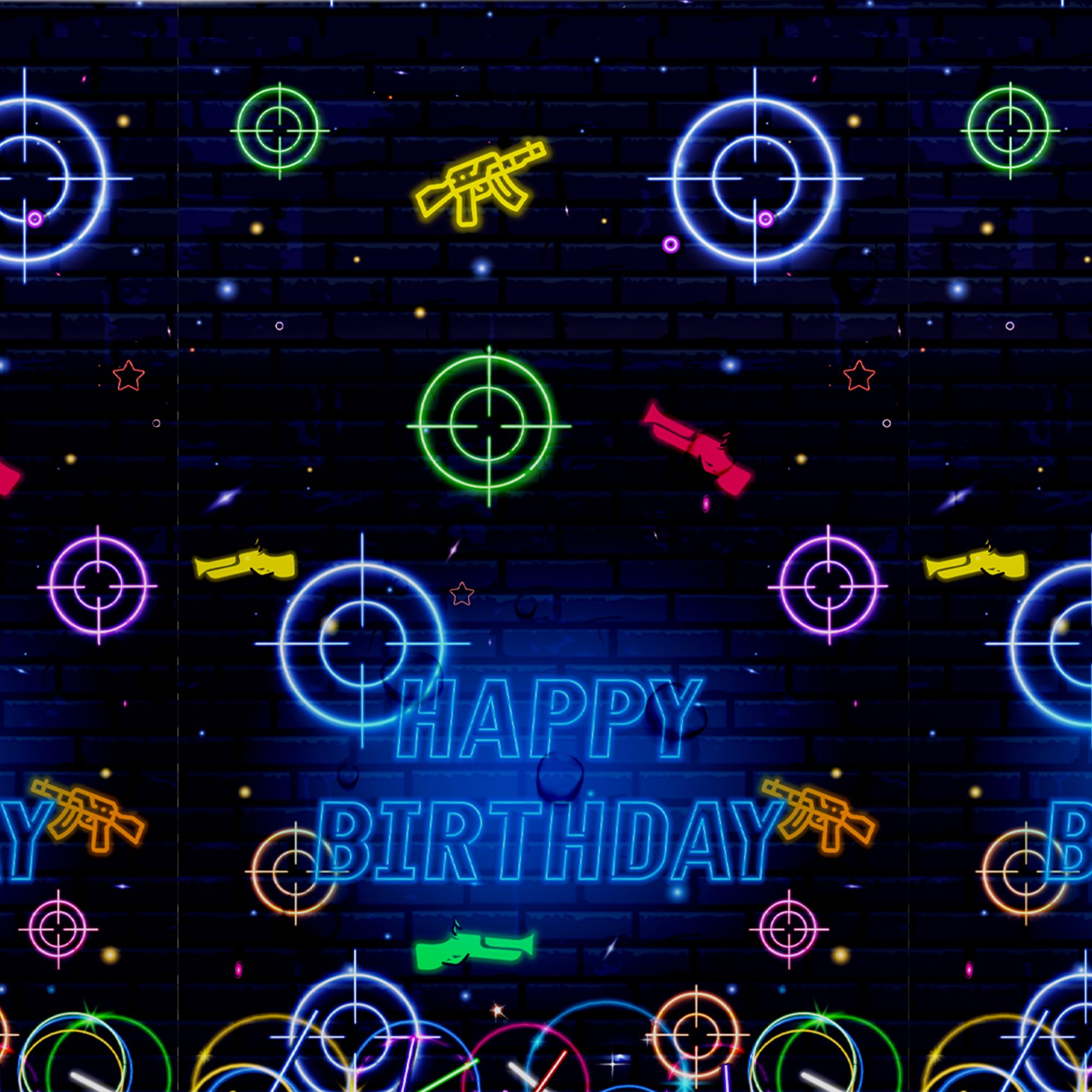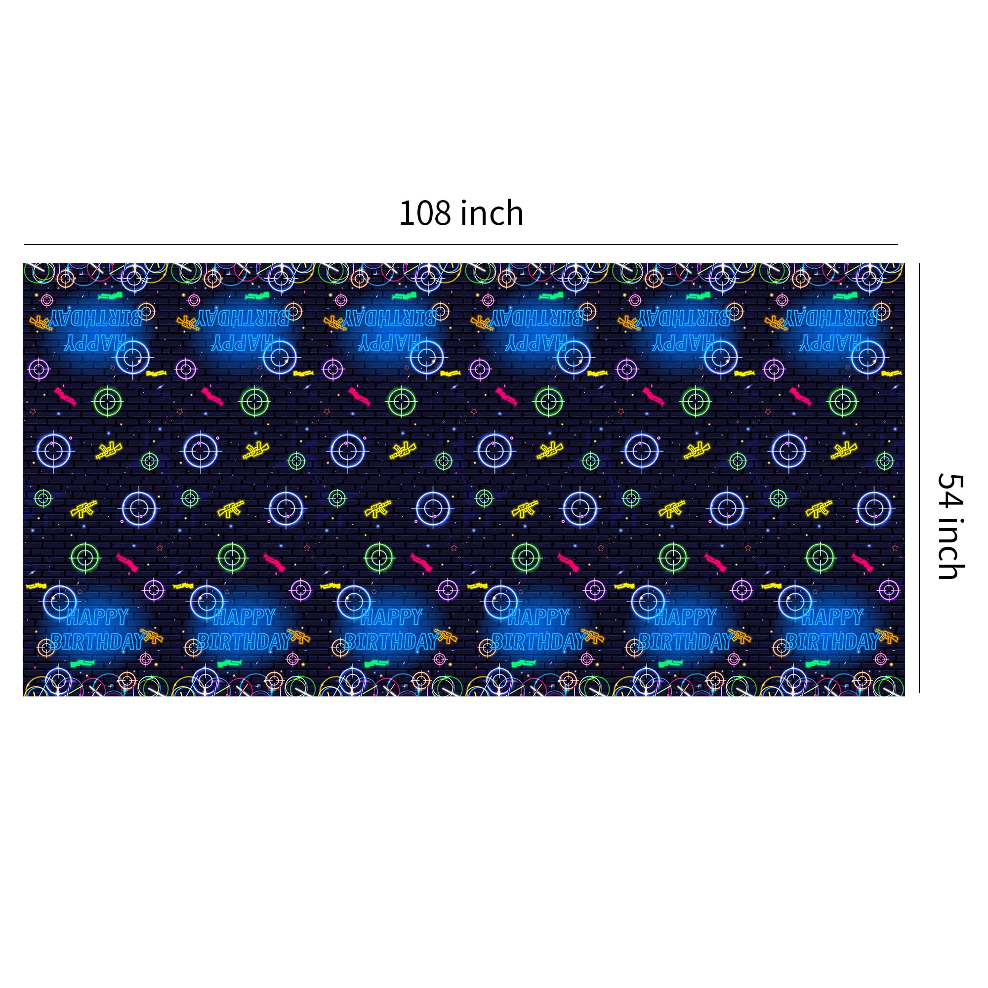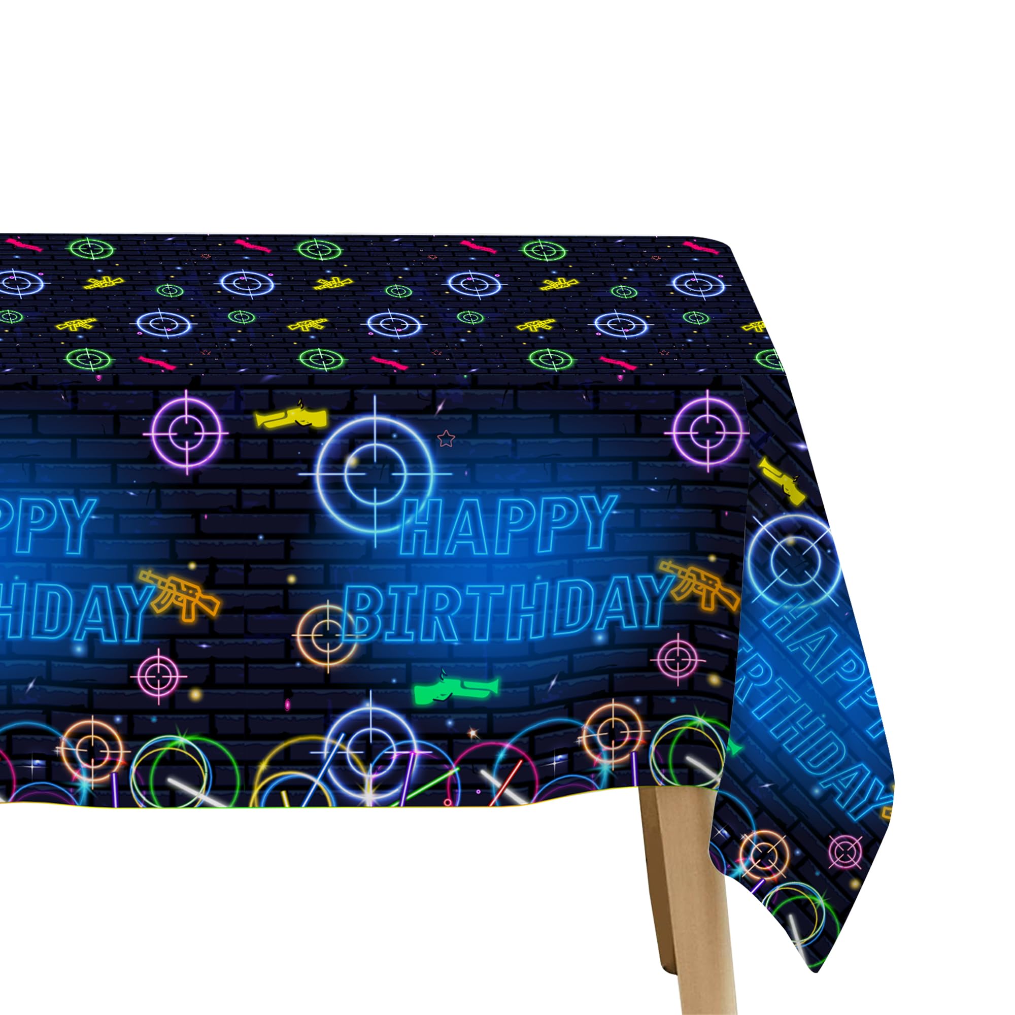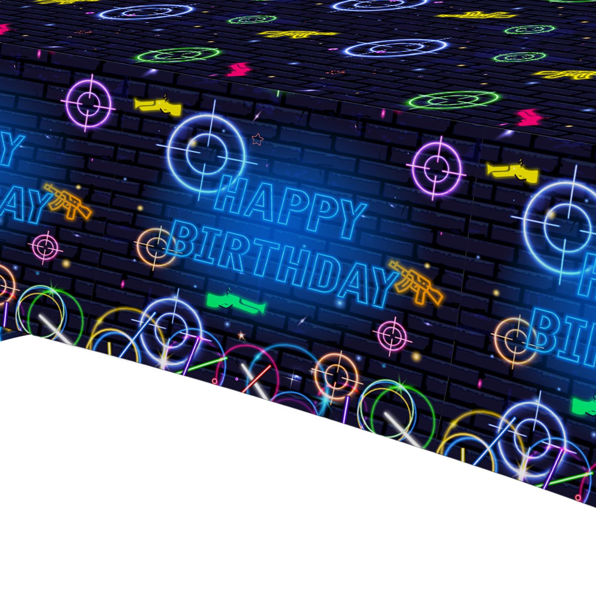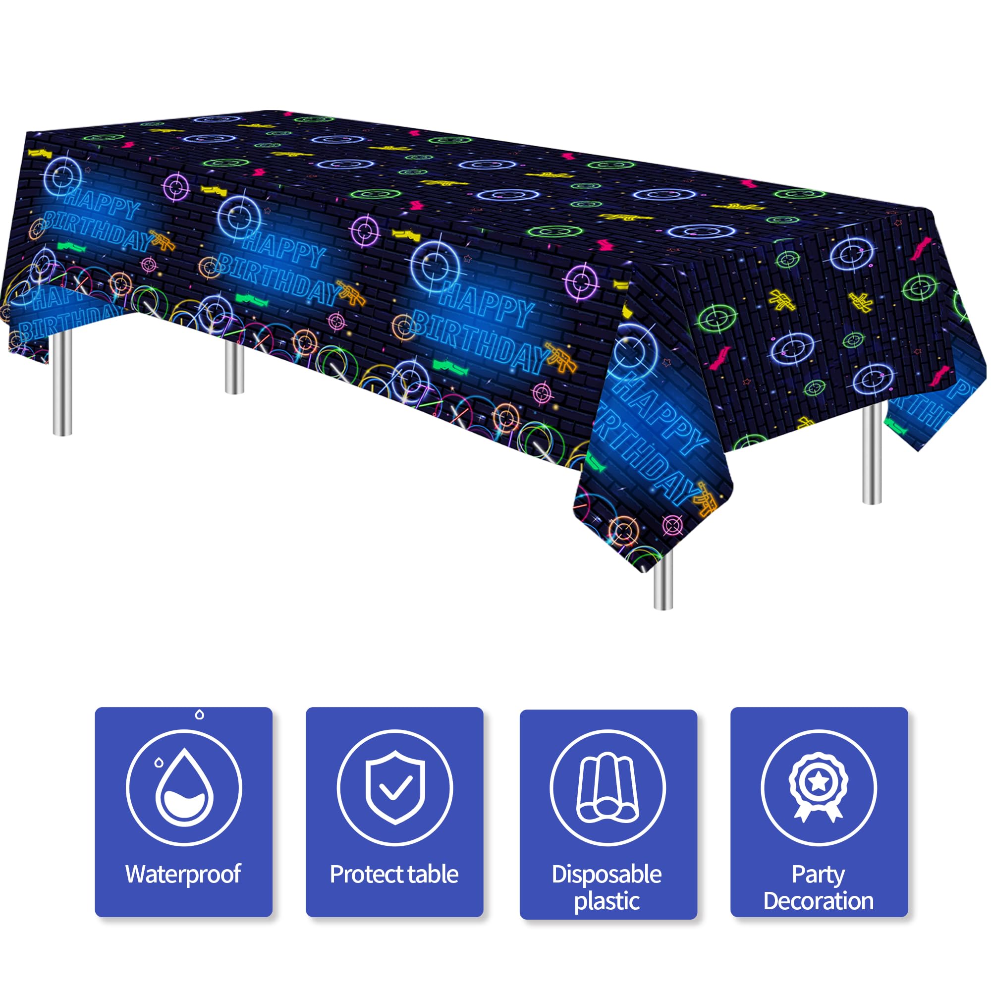 Neon Glow Theme Gaming Laser Tag Birthday Party Tablecloth Includes: Package: 3 Pcs Material: Disposable Size: 108 x 54 inch The laser tag birthday table decorations table covers can be applied for picnic tables, dinner tables, gift tables, and dessert tables ♥ Our disposable tablecloth is perfect for outdoor parties and indoor events alike, get these party supplies ready for a fun party with family and friends!
