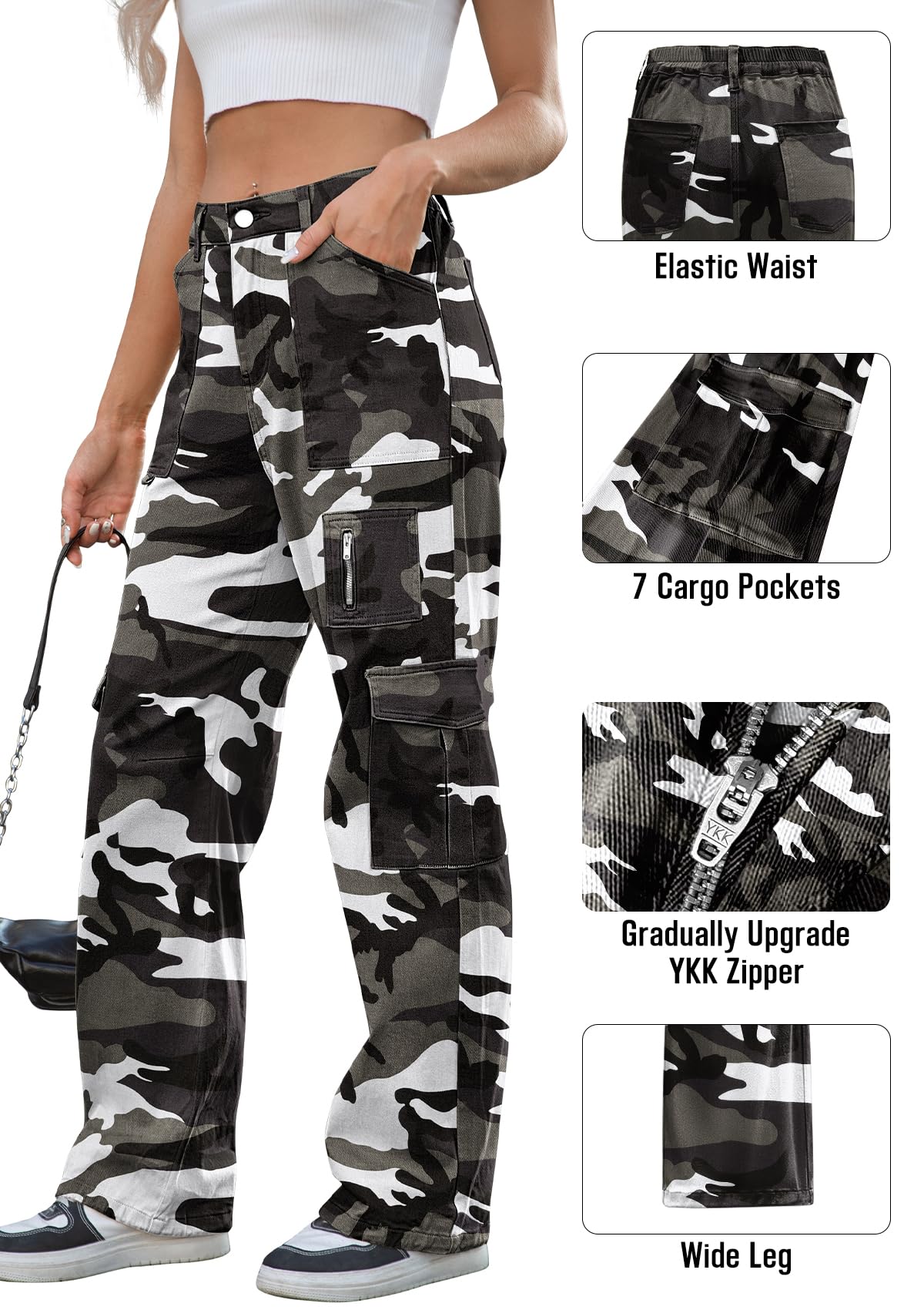 Unique Design: Women high waist cargo pants with pockets, elastic adjustable back waist, wide leg cargo pants, baggy cargo pants, 7 multi-function pockets, the zipper pocket on the left leg make you more stylish and street feel.