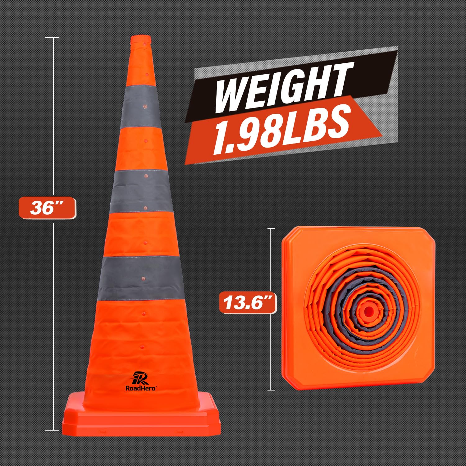 Stable: The base of cones is 13.6" X 13.6" and the weight of each road cone is 1.98 lbs, meaning that they'll stay put exactly where they need to be. Whether you're trying to control driveway traffic or keep footfall in order at a festive event