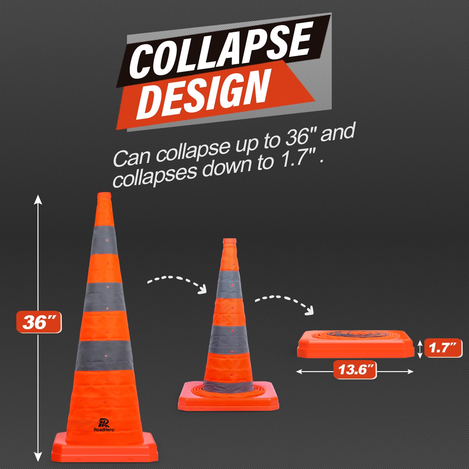 Widely Use: These road cones can collapse up to 36 inches tall, and each cone with 3 reflective collars means people are unlikely to miss them, suitable for parking lots, driving Training, building construction, warning areas