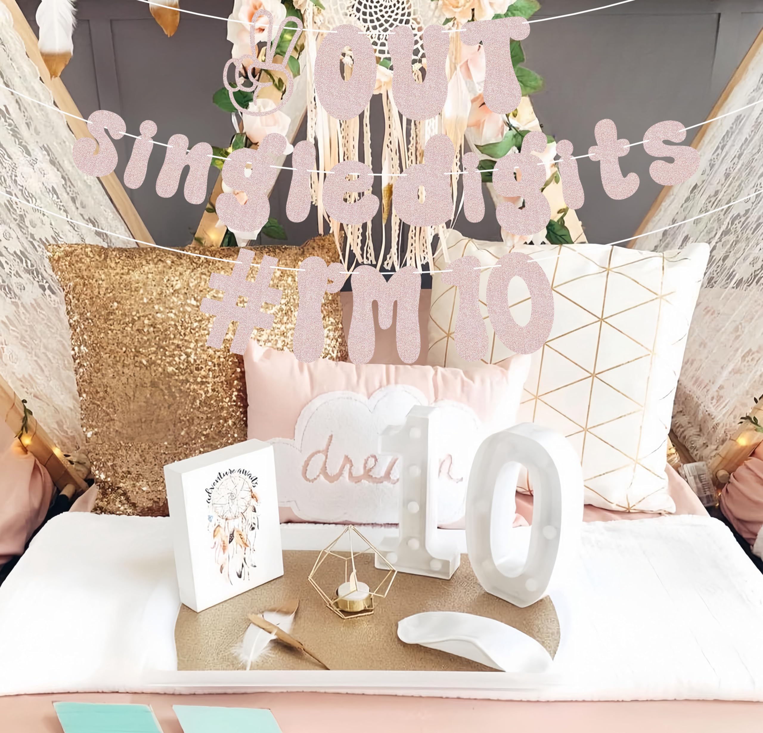 Pre-Strung 10th Birthday Banner - This out single digits I'm 10 banner is made up of 21 sparkling letters and patterns. The 10th birthday banner pre strung on 60 inch ribbon, will not let you waste time assembling.At this moment, all you need to do is hang up the double digits 10 banner and welcome the 10 birthday party