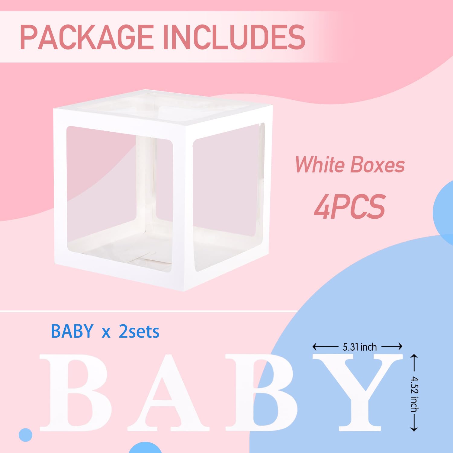 Package Includes: Set of 4 clear balloon boxes with 4 letter BABY for baby shower decoration