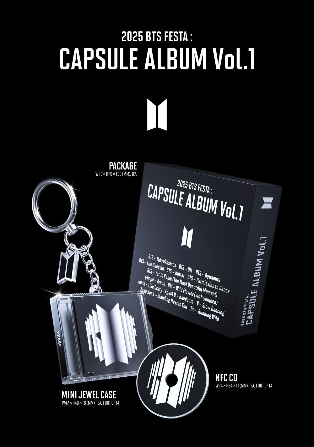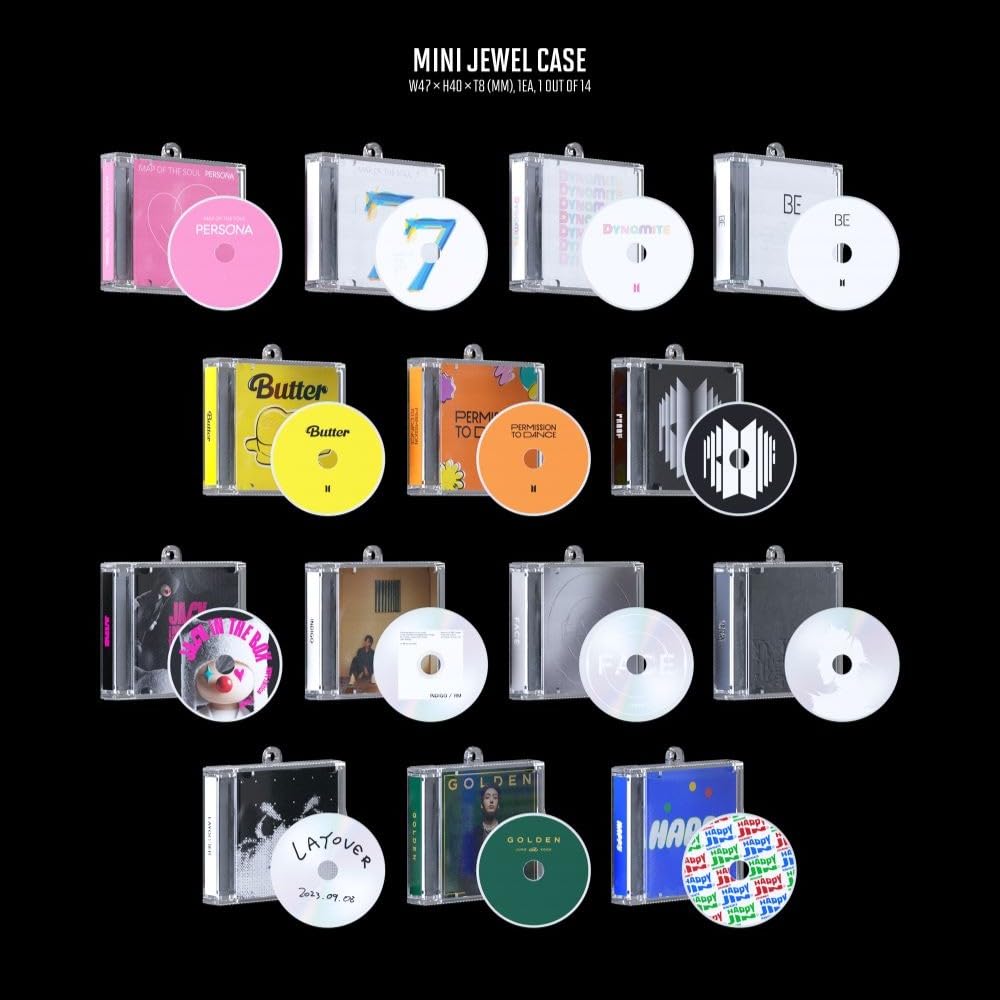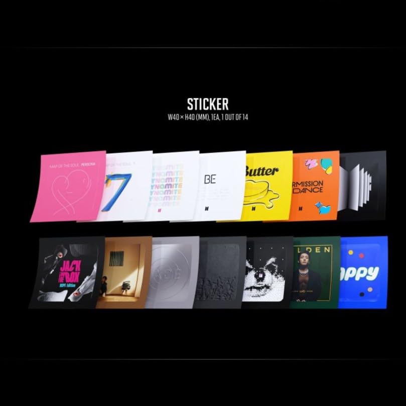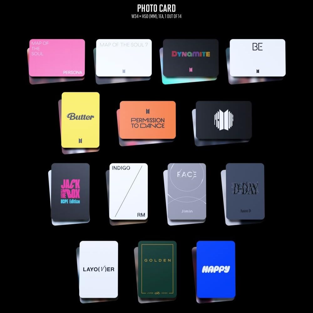 Total: 14 versions BTS Package: 1 type / W70 x H70 x T20 mm Mini Jewel Case: Random 1 out of 14 types / W47 x H40 x T8 mm NFC CD: Random 1 out of 14 types (matches Mini Jewel Case) / W34 x H34 x T1 mm Sticker: Random 1 out of 14 types (matches Mini Jewel Case) / W40 x H40 mm Photocard: Random 1 out of 14 types (matches Mini Jewel Case) / W34 x H50 mm Smart Music Guide: 1 type / W34 x H50 mm