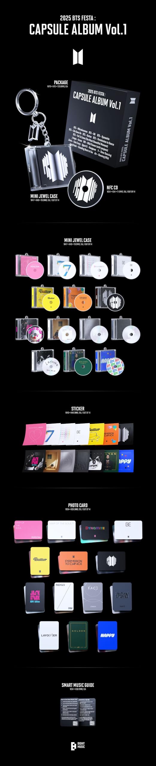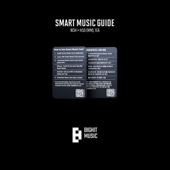 Includes: BTS Package + Mini Jewel Case + NFC CD + Sticker + Photocard + Smart Music Guide
