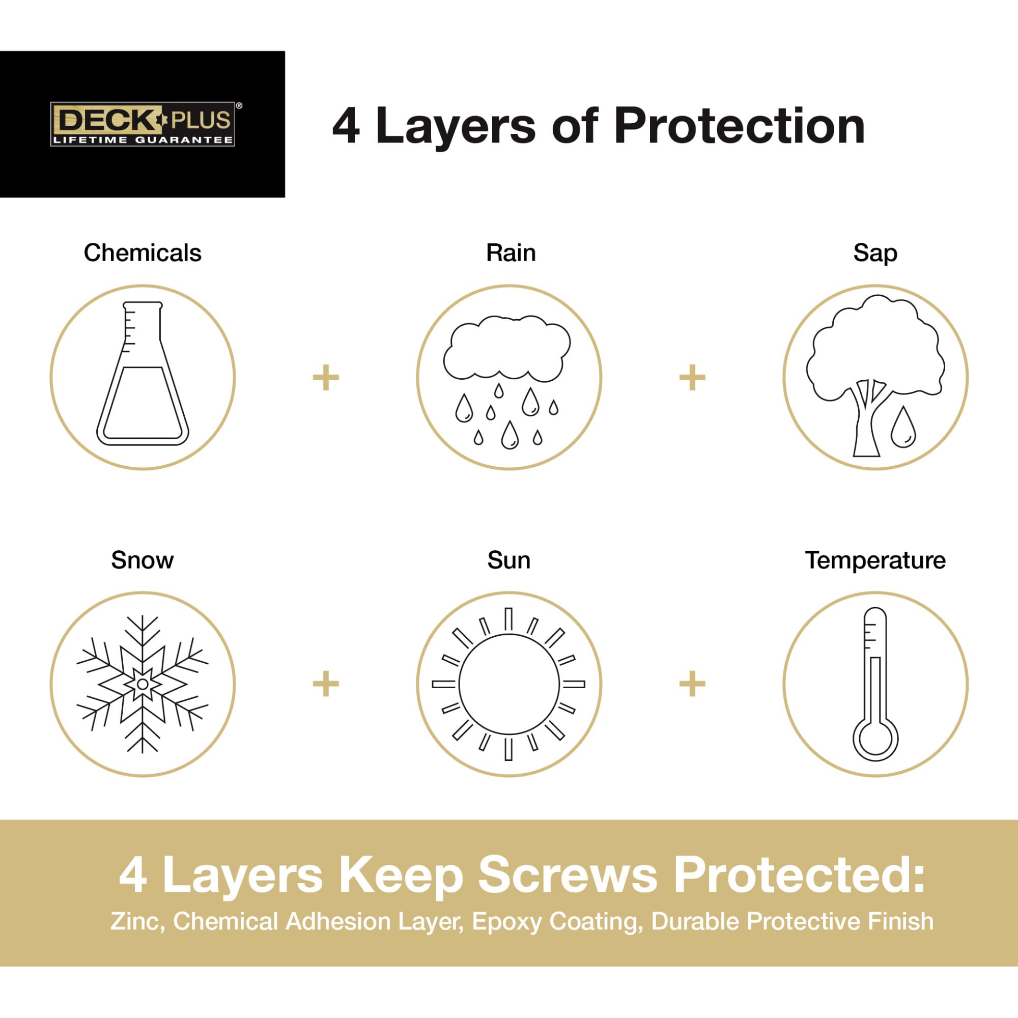 Product Description Deck Plus deck screws provide a versatile and reliable fastening solution for exterior wood, composite, and trim applications, making them ideal for decking, fencing, and other outdoor projects. Designed for convenience, these screws require no pre-drilling, thanks to their coarse threads and self-drilling point that eliminate the need for a pilot hole. A durable 4-layer epoxy coating ensures superior resistance to rust and corrosion, while the Star/Torx drive minimizes slippage and camout for secure installation. Each package includes a free T25 driver bit for added ease, and the screws are backed by a limited lifetime warranty against rust and corrosion. Recommended for use with ACQ, CA, and CCA treated lumber, as they resist corrosion and chemical reactions caused by the wood's preservatives, ensuring long-term durability and structural integrity. From the Manufacturer Deck Plus deck screws provide a versatile and reliable fastening solution for exterior wood, composite, and trim applications, making them ideal for decking, fencing, and other outdoor projects. Designed for convenience, these screws require no pre-drilling, thanks to their coarse threads and self-drilling point that eliminate the need for a pilot hole. A durable 4-layer epoxy coating ensures superior resistance to rust and corrosion, while the Star/Torx drive minimizes slippage and camout for secure installation. Each package includes a T25 driver bit for added ease, and the screws are backed by a limited lifetime warranty against rust and corrosion.
