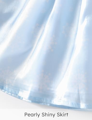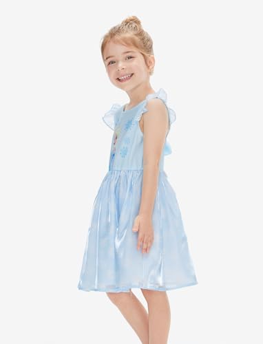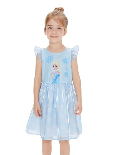 Elegant Elsa Snowflake Dress: Featuring a shimmering light blue palette, this sleeveless dress showcases Elsa surrounded by delicate snowflake prints on both the bodice and skirt. The flutter sleeves and lightweight mesh overlay create a fantasy, princess-like lookβperfect for Frozen fans to sparkle with comfort and charm at any occasion