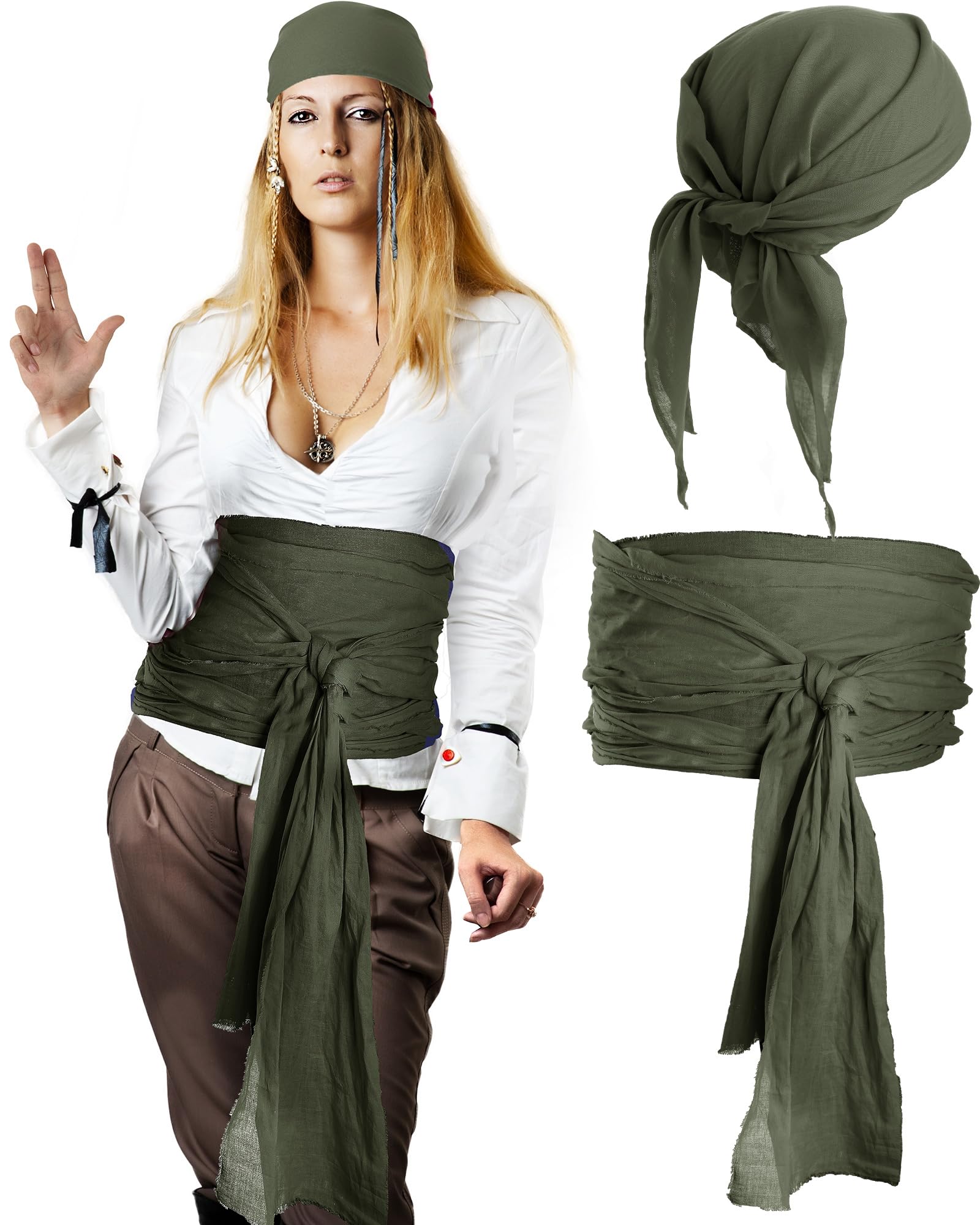 Description Pirate Halloween costume medieval renaissance linen bandana and large sash waist belt accessory Features: Quality material: Our bandana and large sash are all made of linen, soft and light, comfortable and easy to wear. Function: Suitable for pirate dress up parties, pirate role play, Halloween Christmas night, stage performances, cosplay, role play, masquerade, Mardi gras, birthday, photography or daily wear. Specifications: Quantity: 2 pieces Color: as the picture shows Material: linen fabric Package includes: 1 x Pirate bandana 1 x Pirate large sash Note: Please make sure the size before you buy it.