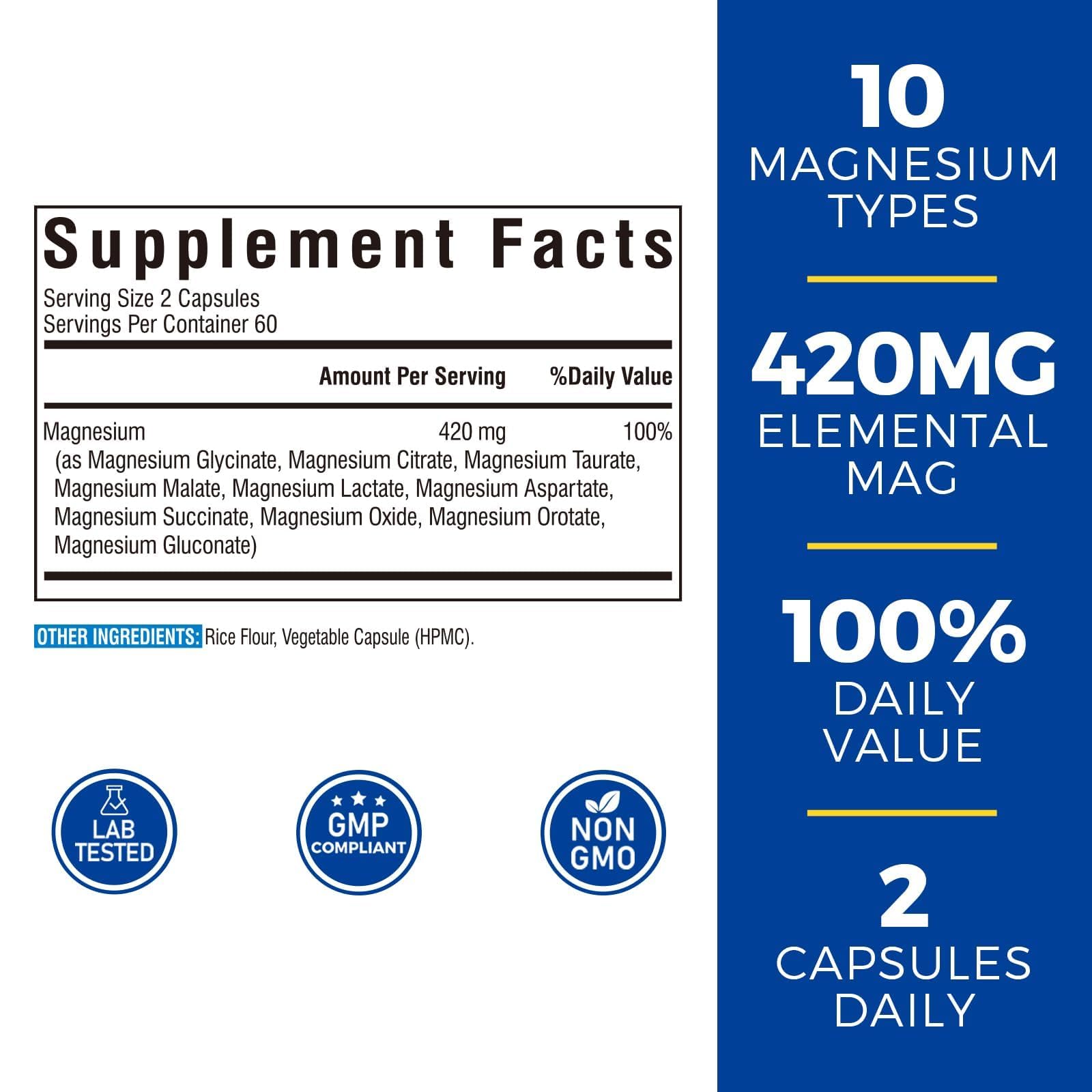 Comprehensive 10-Type Magnesium Blend: Say goodbye to magnesium supplements only offering a single magnesium compound and simplify your daily health routine! Our all-in-one formula contains 10 full spectrum types of magnesium in each capsule to provide all the magnesium you need in one supplement, making it a more convenient and cost-friendly choice
