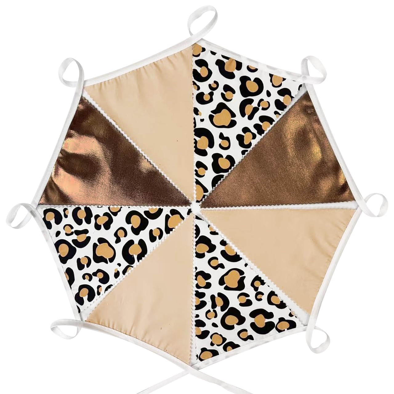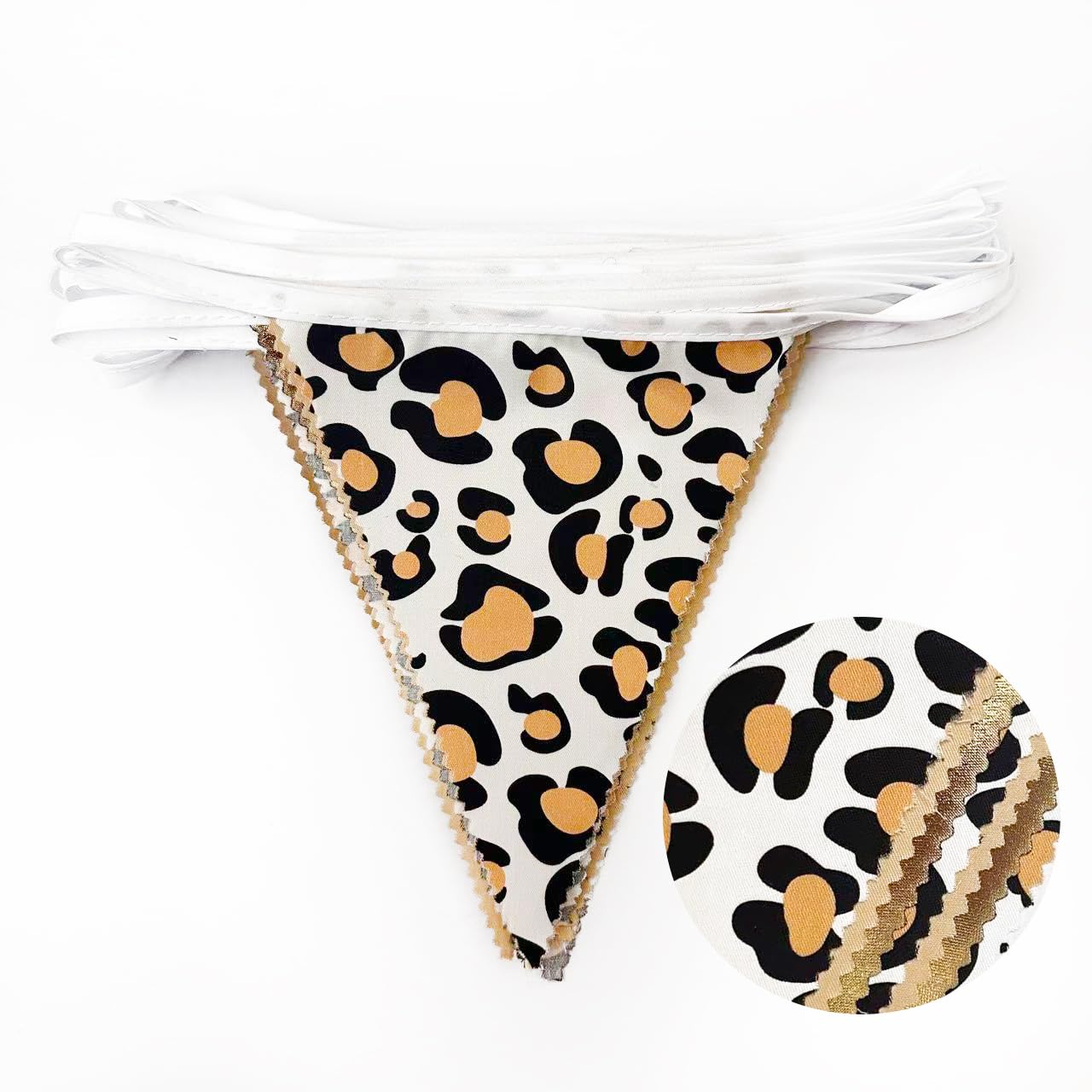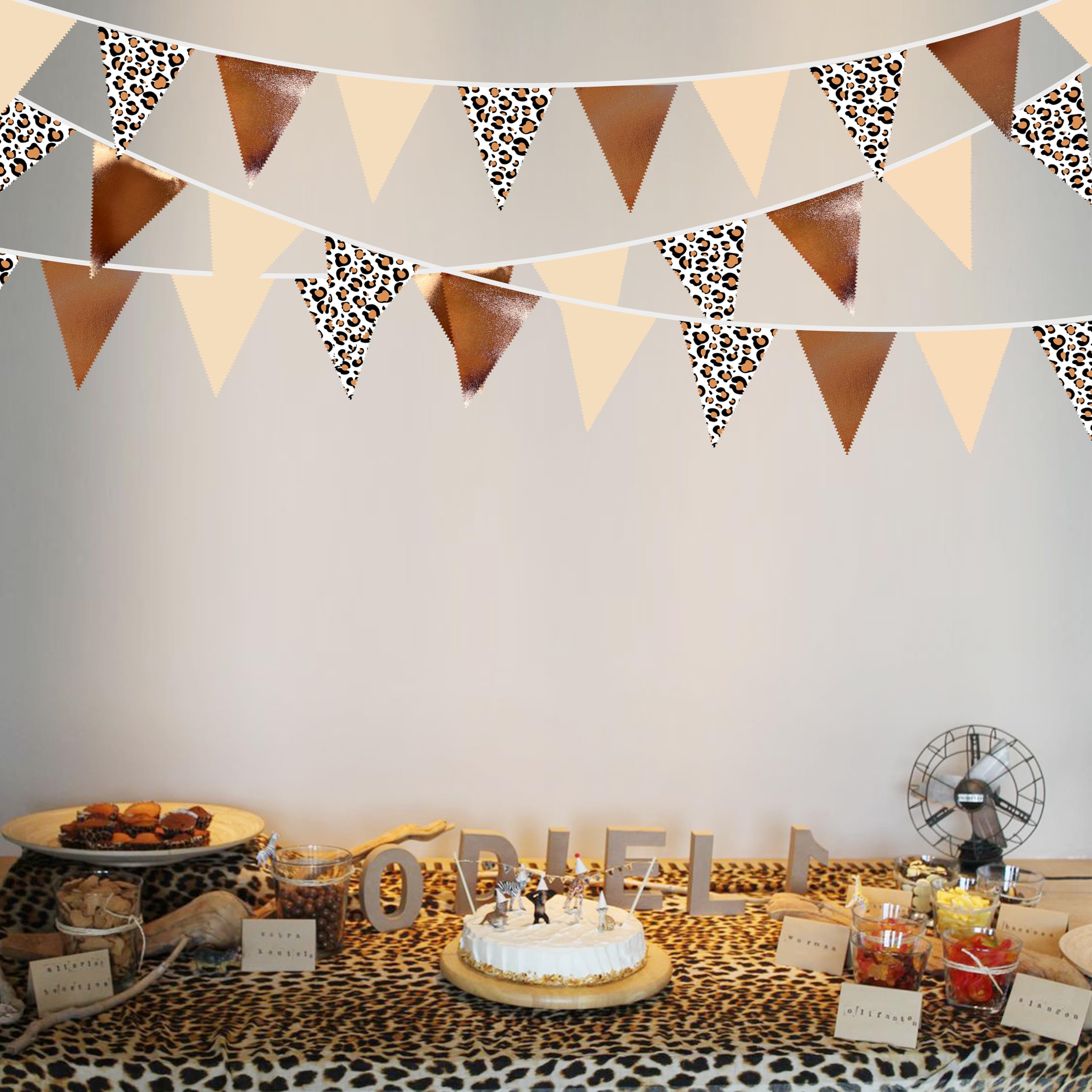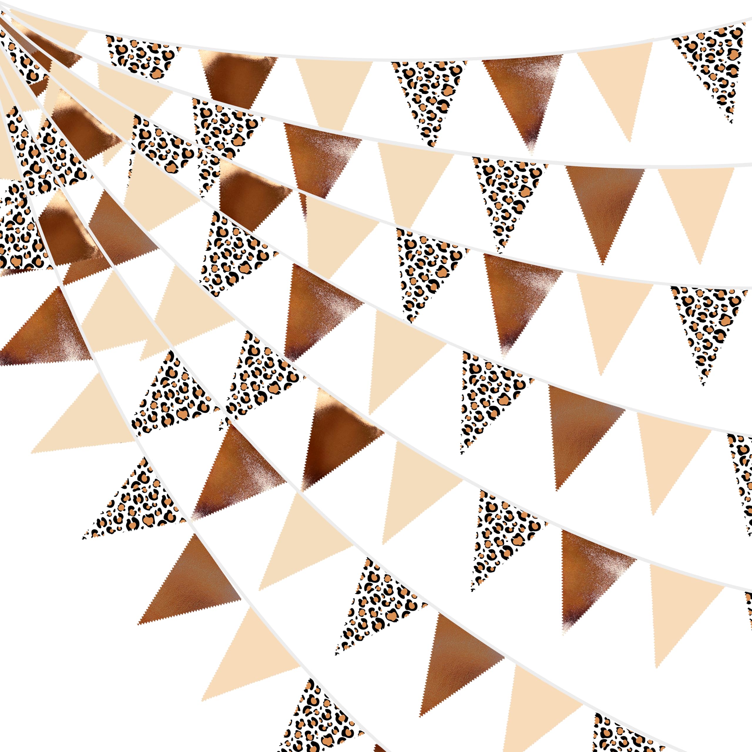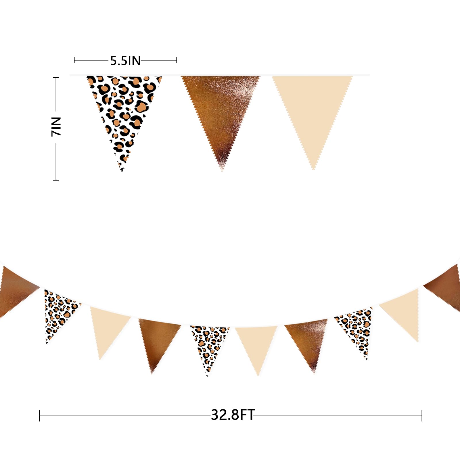 Package Including:1 pack cheetah theme fabric bunting banner garland in metallic brown, nude and leopard printed colors, with 36pcs flags in 10M/32.8Feet. Flag Size: 5.5in width x 7in height.