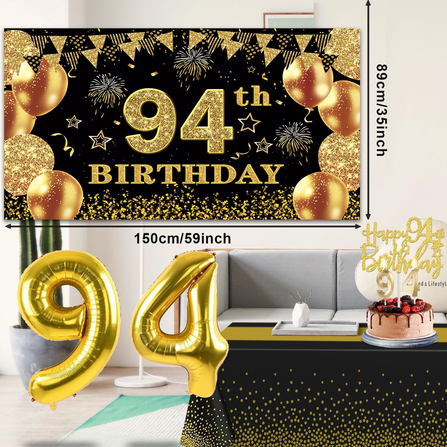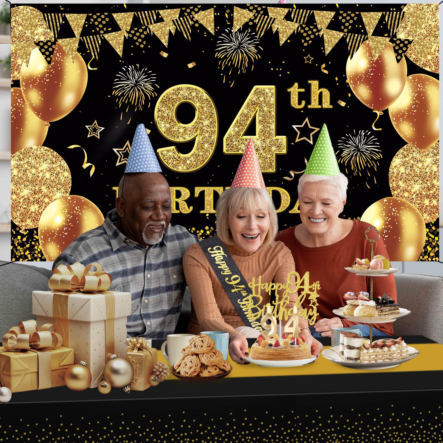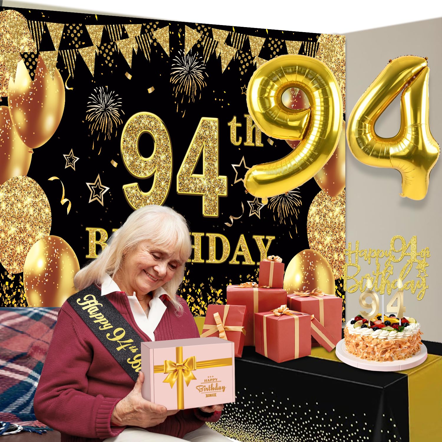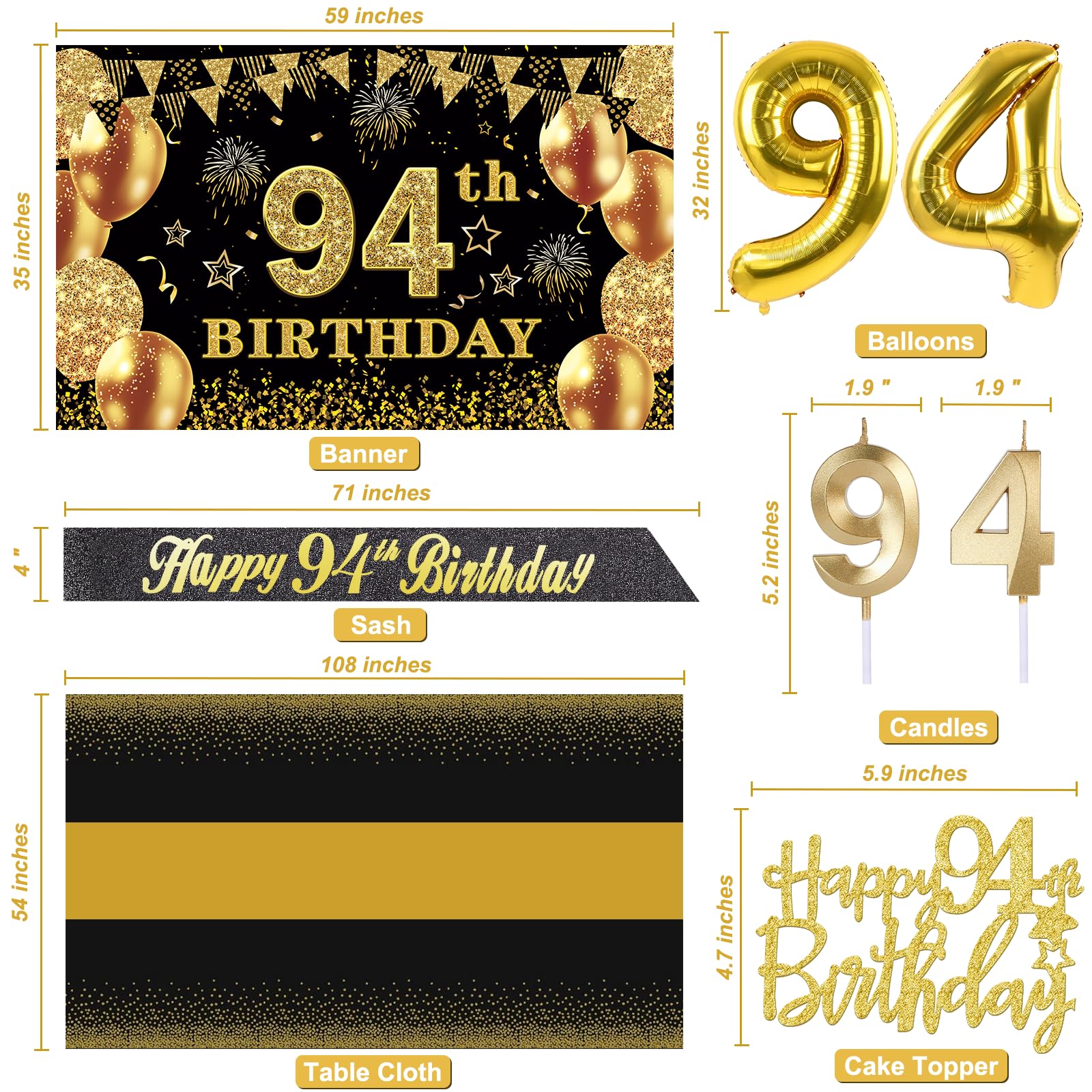 94th Birthday Decorations Kit: Packing coming with Large 94th Birthday Banner x 1pc, Big Gold 94th Birthday Balloons x 1set, Black and Gold Table Cloth x 1pc, Black Glittery with Gold Foil Words Happy 94th Birthday Sash x 1pc, Happy 94th Birthday Cake Topper x 1pc, Gold Number 94 Candles x 1set. This Value Black and Gold Party Decorations Set Meet Your Every Needs and Expects in 94th Birthday Milestone