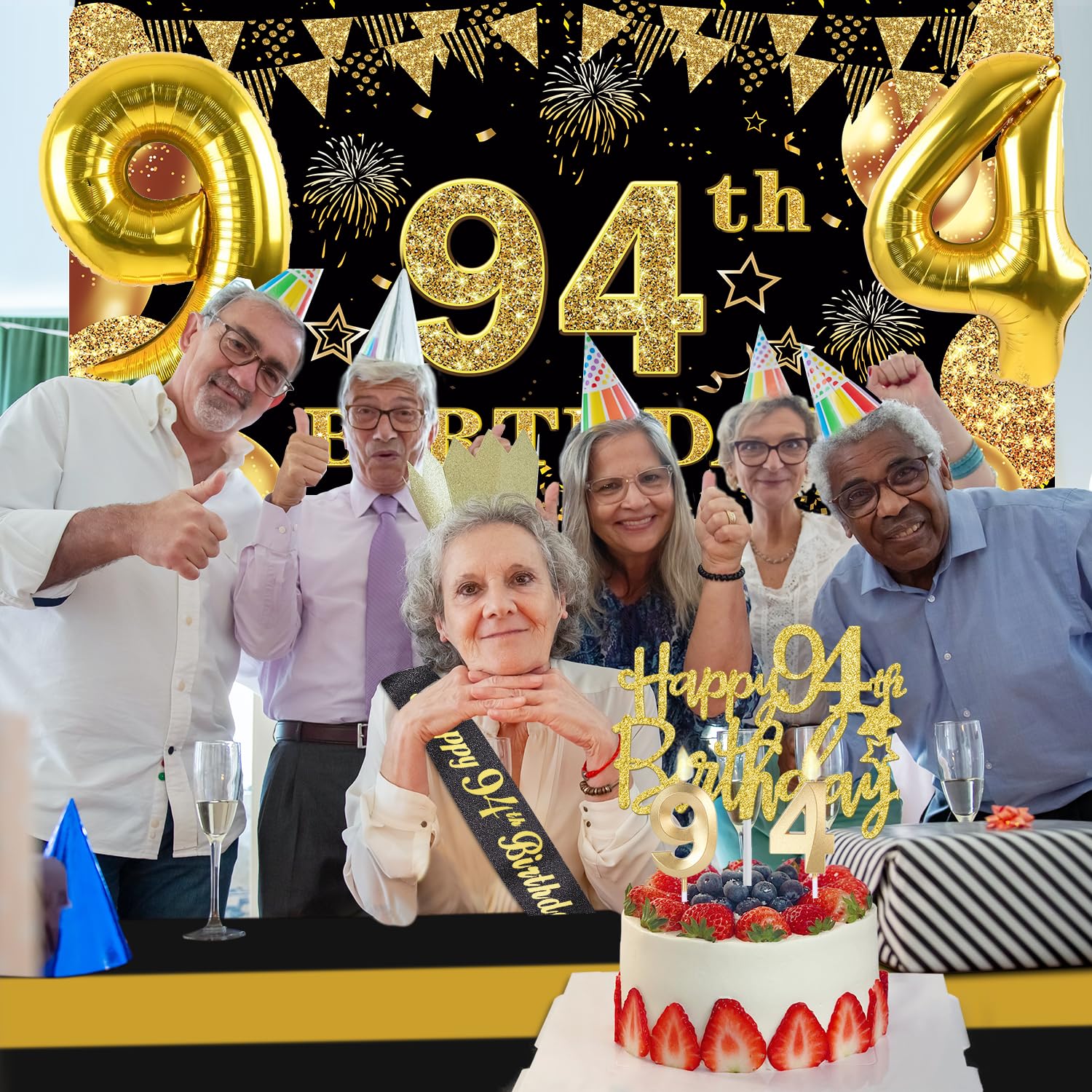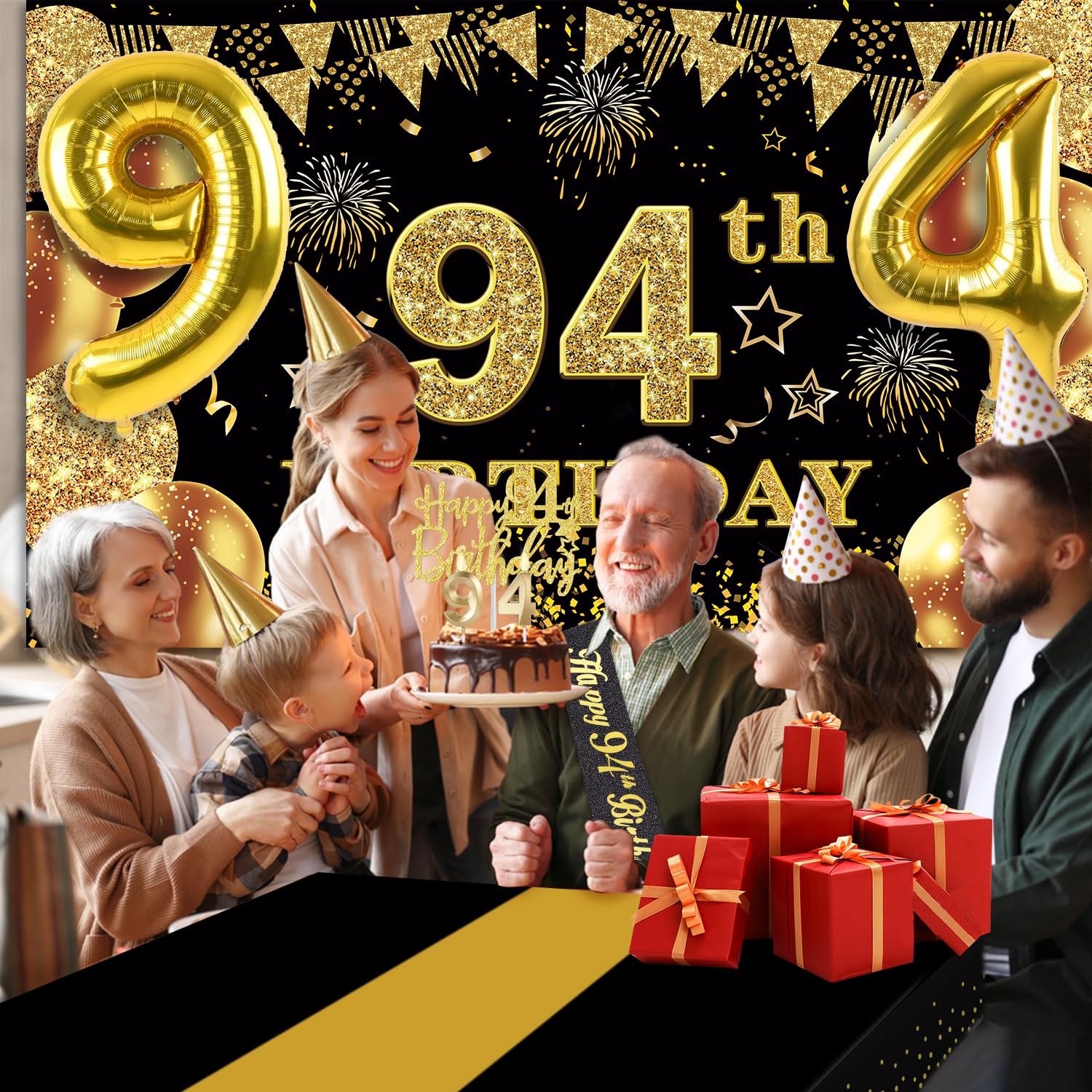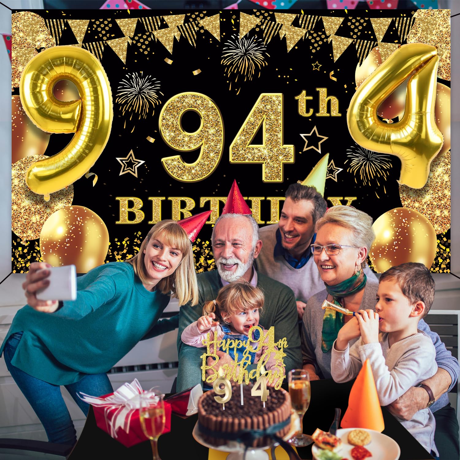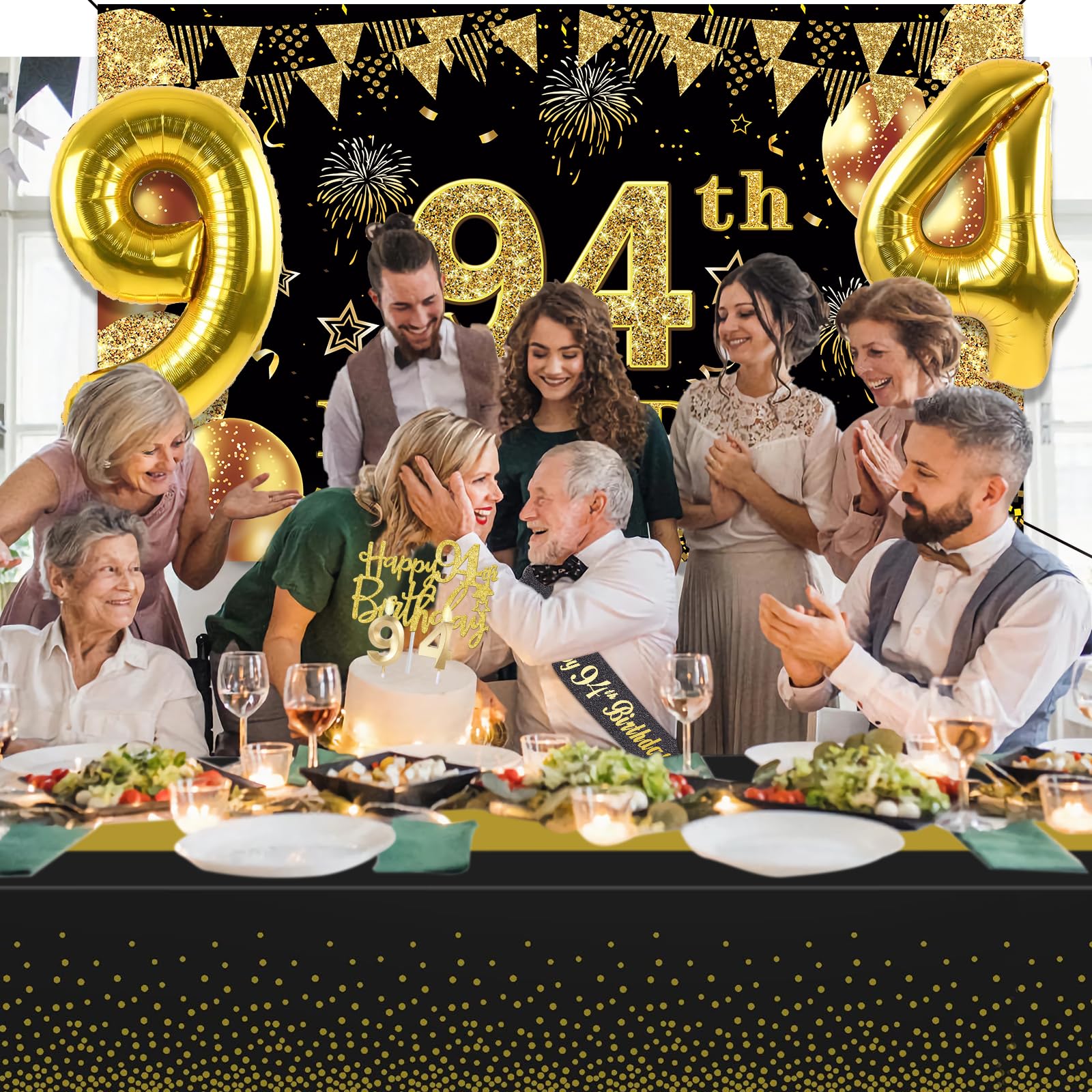 94th Birthday Decorations Kit: Packing coming with Large 94th Birthday Banner x 1pc, Big Gold 94th Birthday Balloons x 1set, Black and Gold Table Cloth x 1pc, Black Glittery with Gold Foil Words Happy 94th Birthday Sash x 1pc, Happy 94th Birthday Cake Topper x 1pc, Gold Number 94 Candles x 1set. This Value Black and Gold Party Decorations Set Meet Your Every Needs and Expects in 94th Birthday Milestone
