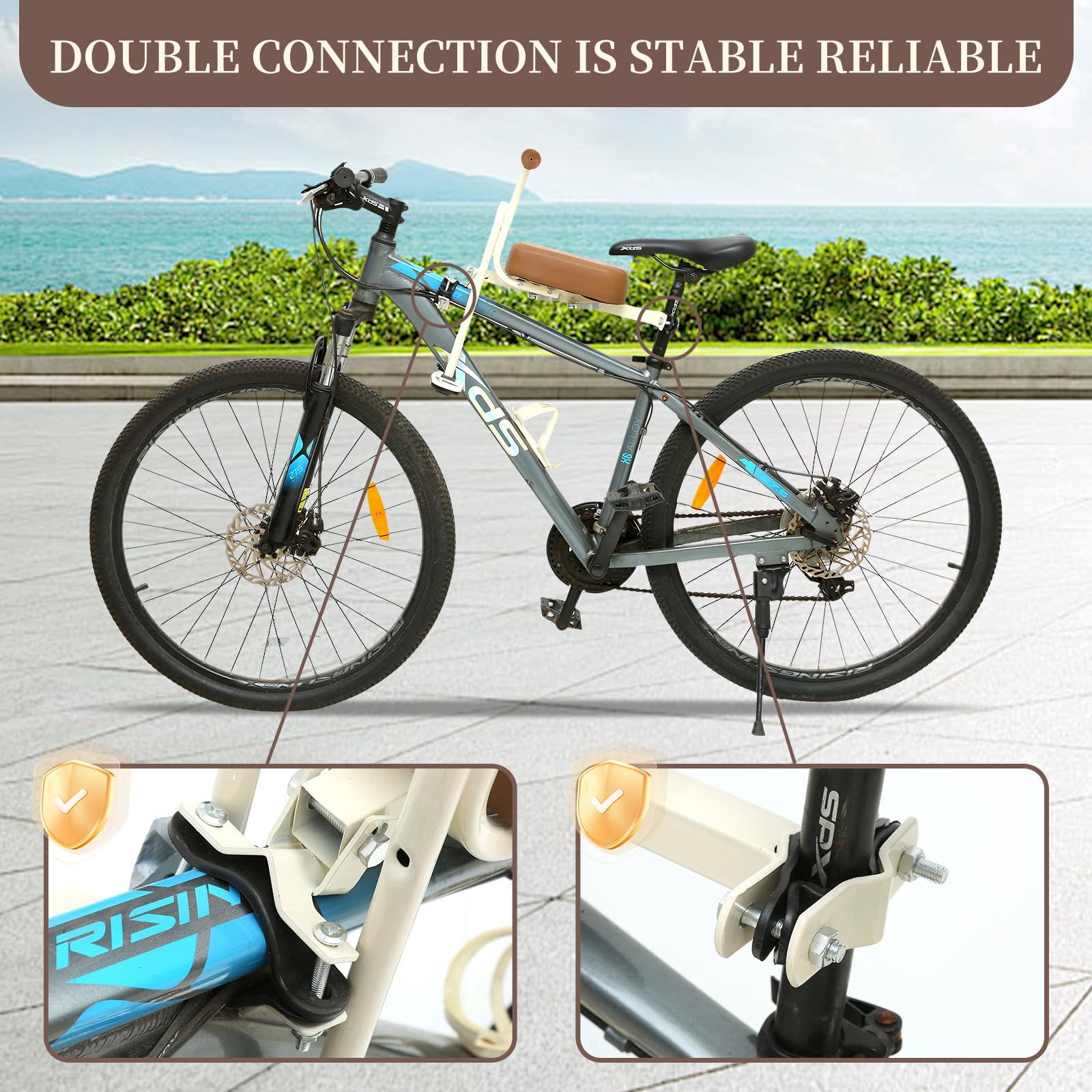 【Safety and Comfort】The metal part of the child bike seat is made of aluminum alloy, which is more portable and safe. The bracket part is also structurally strengthened, which can extremely protect your child's safety. The inner side is made of rubber, which will not scratch any parts of the bicycle and is more protective for children.The seat saddle is made of leather, soft and smooth, allowing your child to enjoy a pleasant ride while also maintaining comfort.