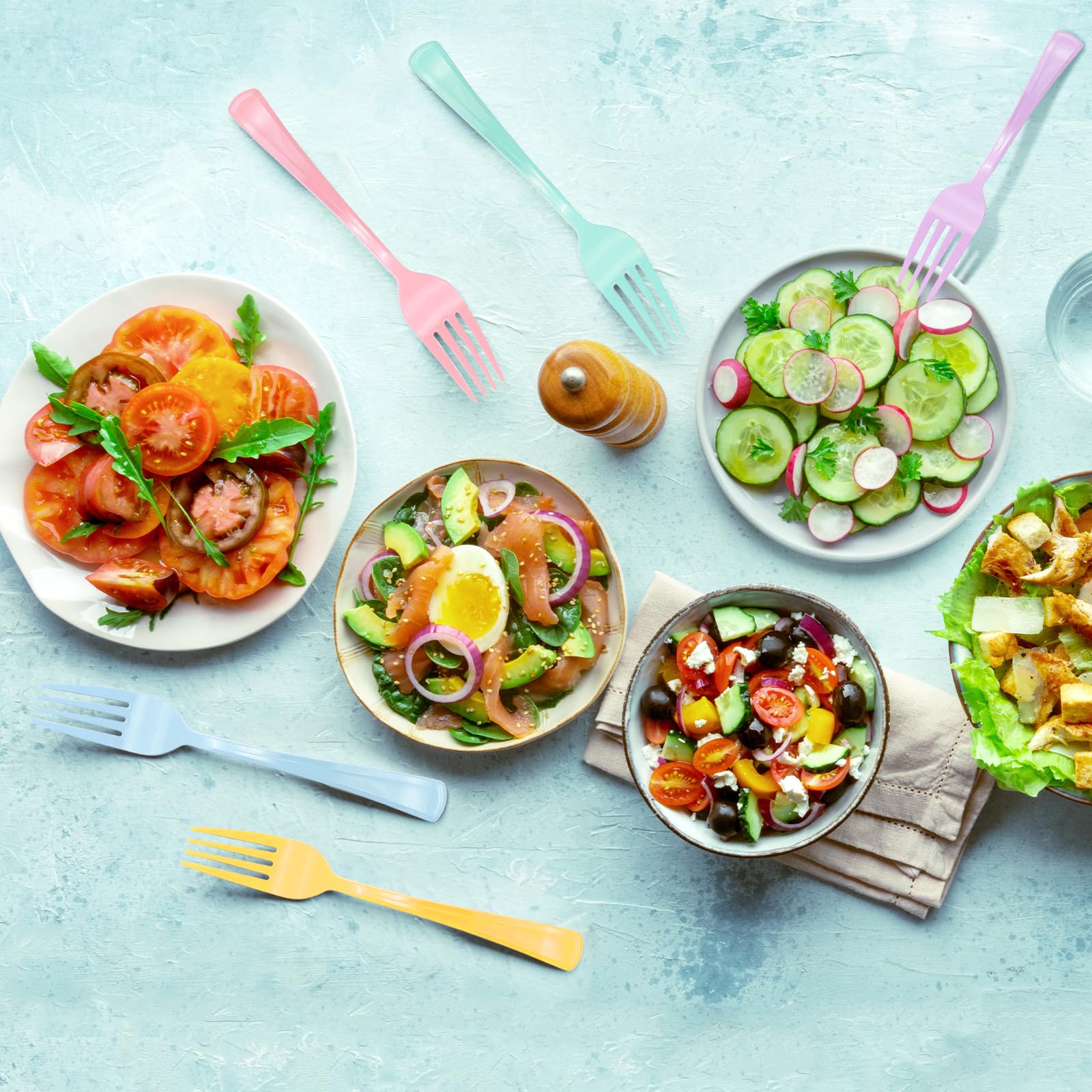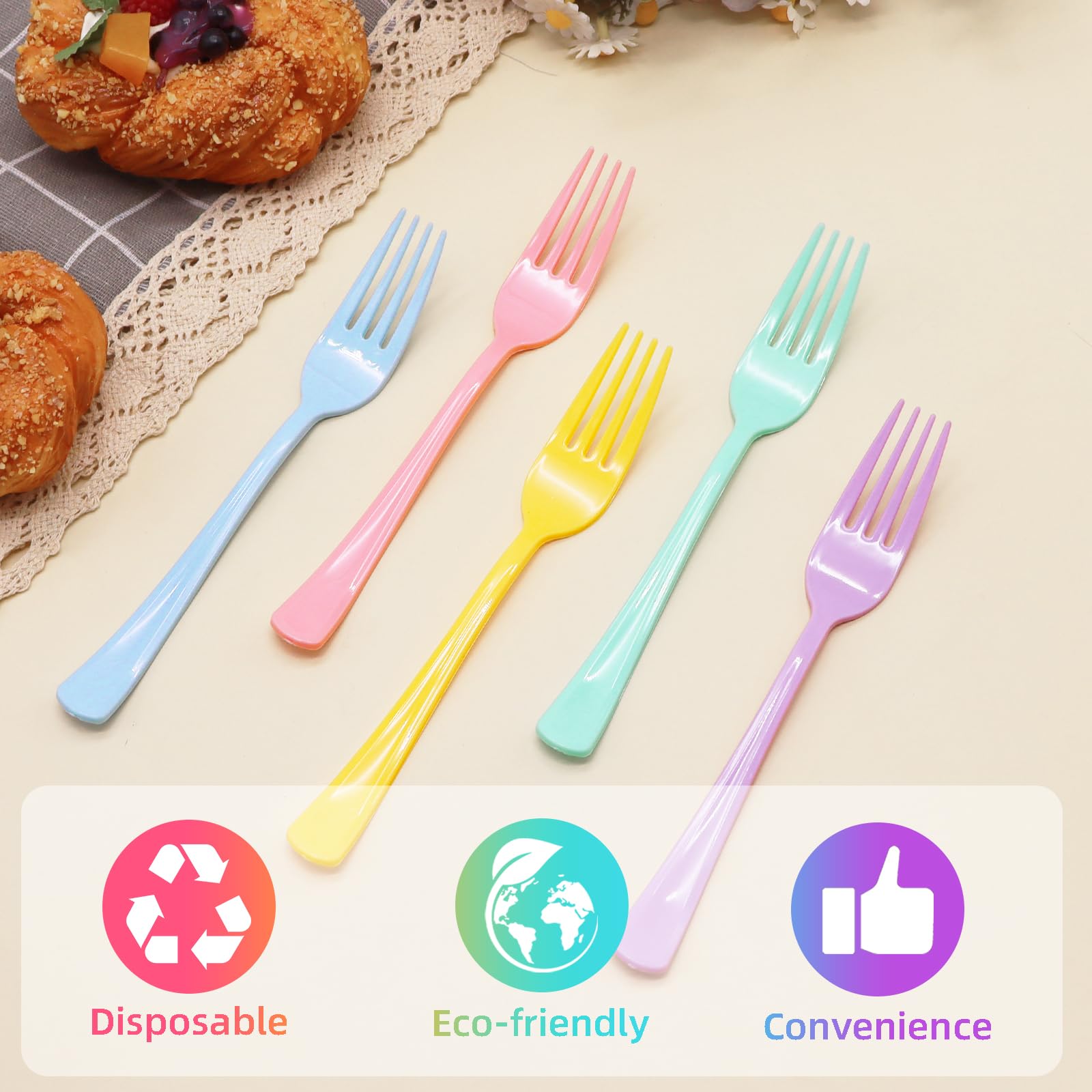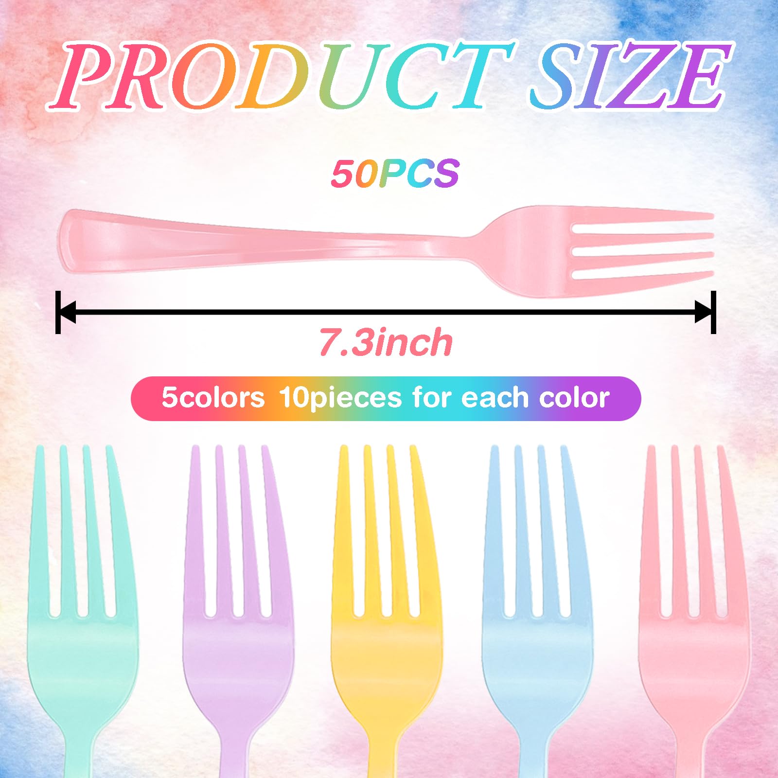 【Sufficient Quantity】:This heavy duty disposable plastic forks, serves 50 guests, 10 each, for a total of 50 plastic forks, perfect for family dinners, friends parties, outdoor picnics and other large and small gatherings. No need to worry about insufficient cutlery, one-time preparation, easy to meet the needs of the party.