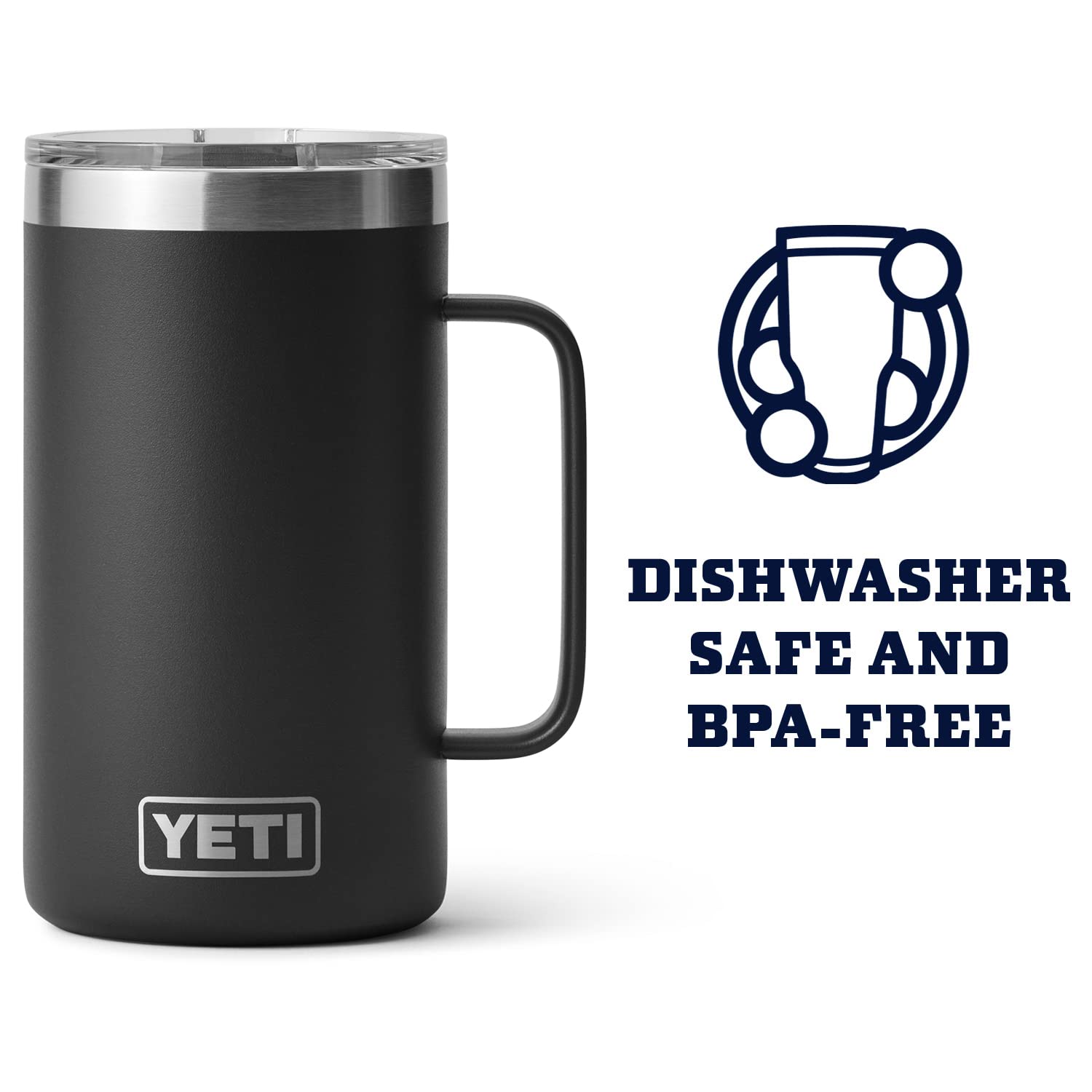 The YETI 24 oz. Rambler Mug stands 6.4 in high and has a lip diameter of 4.6 in, and with the handle its 5 inches wide