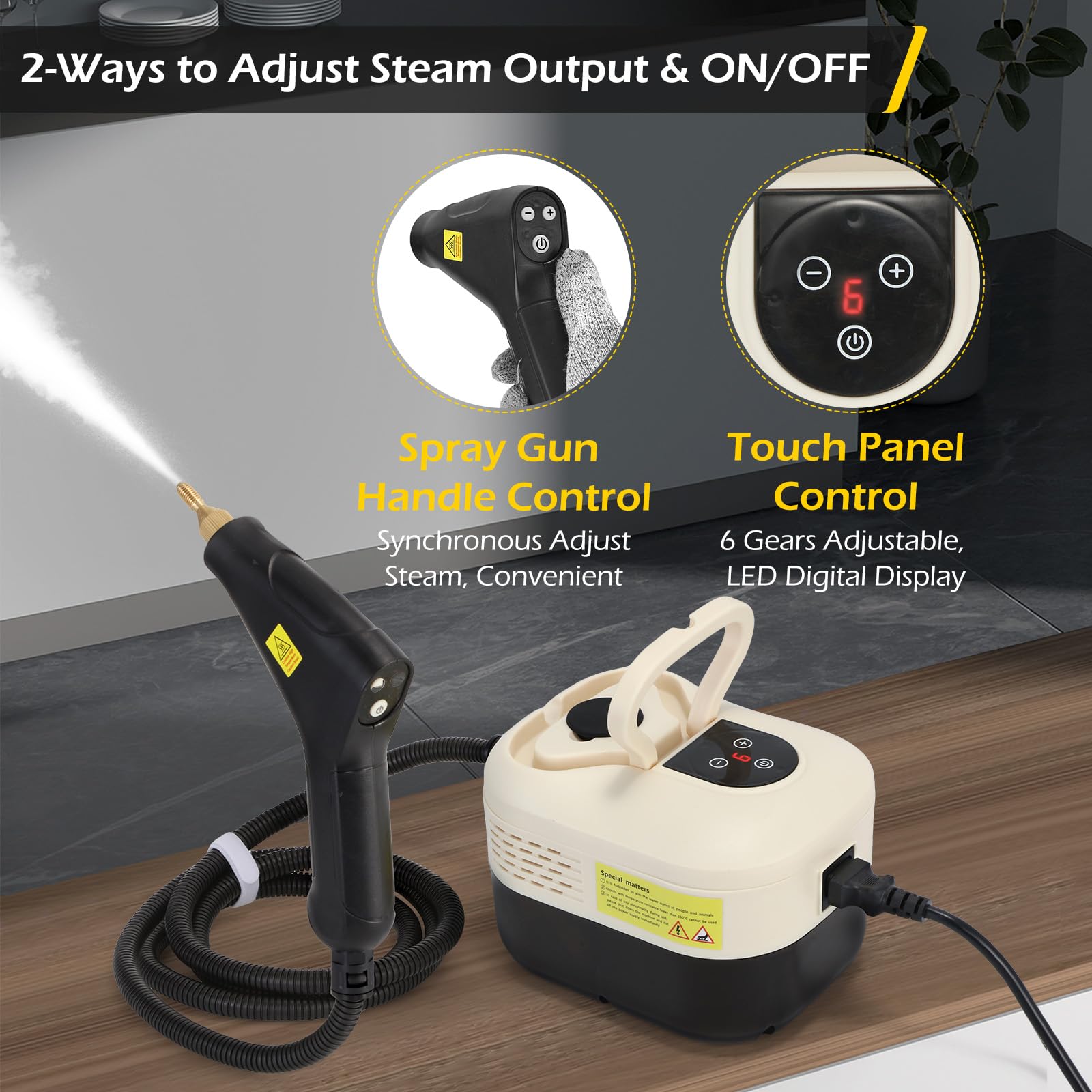 【 Intelligent Touch Panel & Spray Gun Control】Dyna-Living steam cleaner for home have 6 levels of steam adjustment, 2-ways to adjust steam output & control ON/OFF, you can control the steam volume by the touch screen buttons or the buttons on the spray gun handle at any time makes the cleaning process more efficient.