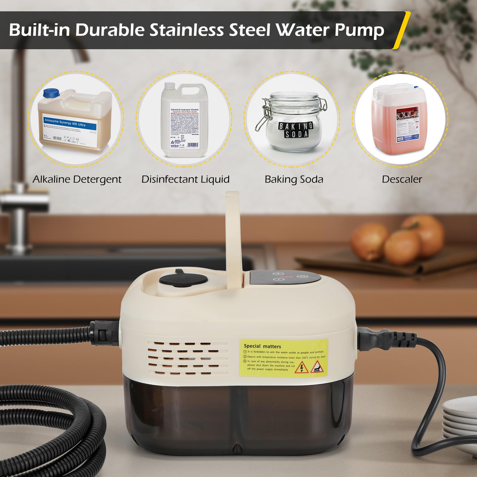 【1500W High-Pressure Steam Cleaner】Dyna-Living steam cleaner for cleaning can generate steam up to 105℃/221℉ high temperature and 4.5 BAR pressure steam in less than 15S; The car steam cleaner can easily remove stubborn grease, dirt and stains from a variety of surfaces, completely chemical-free, with no harmful fumes or residue.