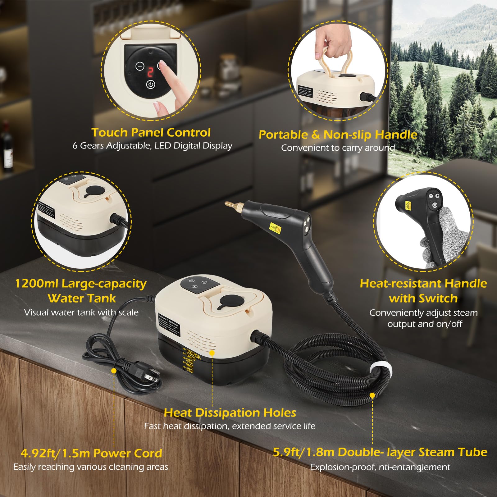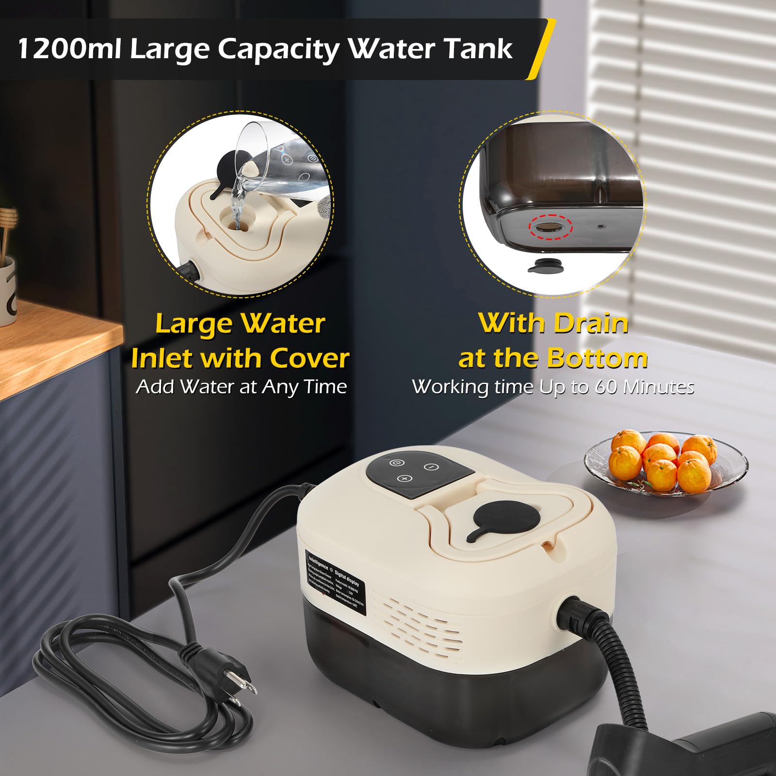【1200ML Water Tank & Bottom Drain】The handheld steam cleaner is equipped with a 1200ml large-capacity water tank with scale and a large water inlet, the remaining water volume is clearly visible, can easily add water at any time, the steamer for cleaning can work continuously for 1 hour without adding water frequently. The bottom is equipped with a drain port, which is convenient for drainage, reduces water residue, and extends the service life of the steam cleaner.