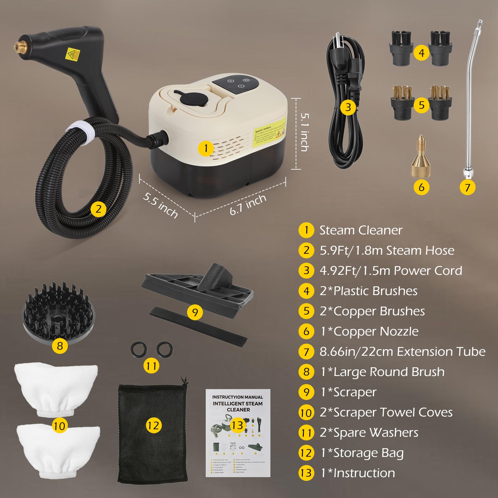 【Various Nozzle Brushes】The car steamer for auto detailling quipped with 1*8.66in/22cm extension tube, 1*large round brush, 2*copper brush and 2*plastic brush, 1*scraper and 2*scraper towel coves, according to different cleaning needs, you can freely combine brushes to easily meet various daily cleaning needs, 360º chemical-free cleaning of car details, kitchen utensils, cleans bathtubs and showers, cleaning carpets and sofas.