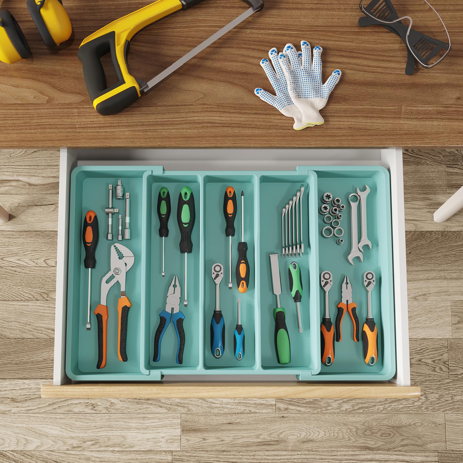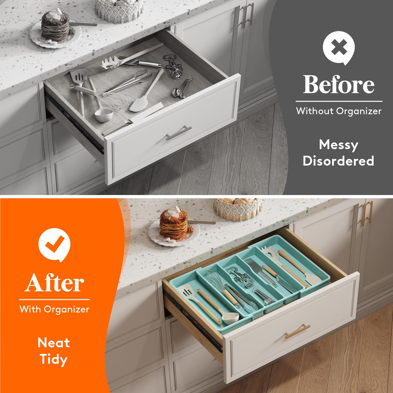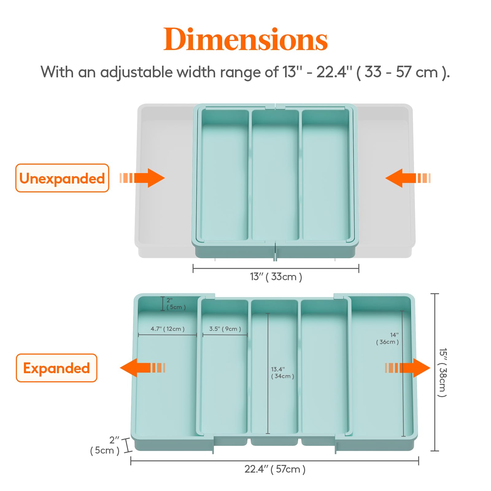 Expandable and Adjustable: The utensil organizer for kitchen drawers can be expanded from 3 slots to 5 slots, offering extra storage space for utensils. It is adjustable to fit different drawer sizes, ranging from 13 to 22.4 inches wide. When folded, it measures 13" x 15" x 2", but expands to 22.4" x 15" x 2" for added space.