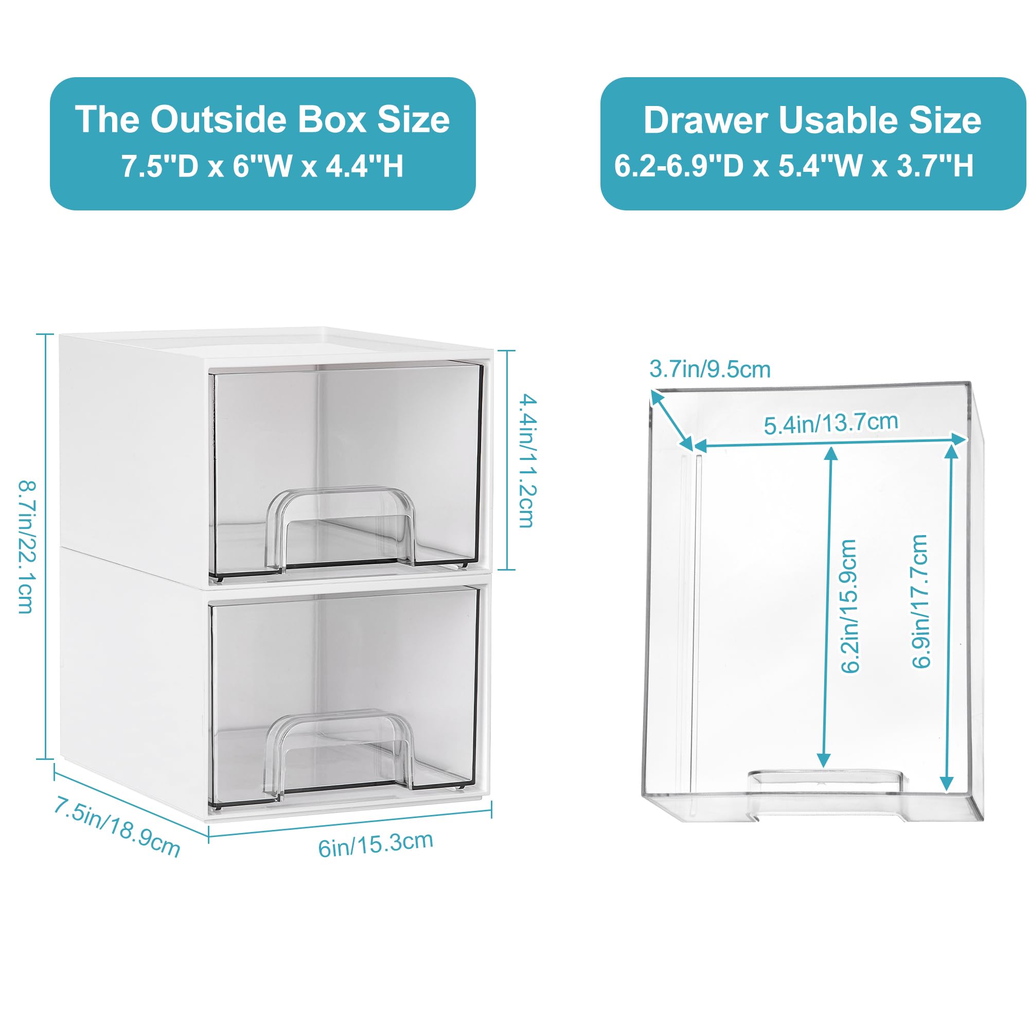 [Stackable Design] Come with 4 drawer storage organizers, the outside box measures 7.5"D x 6"W x 4.4"H,the drawer measures 7.1"D x 5.6"W x 3.7"H,it is usable size. Please measure the space of using before purchasing.The storage containers are stackable, vertical storage will save a lot of space. You can also use them side by side. Put your small objects on top of acrylic bins to make your countertop space more tidy.