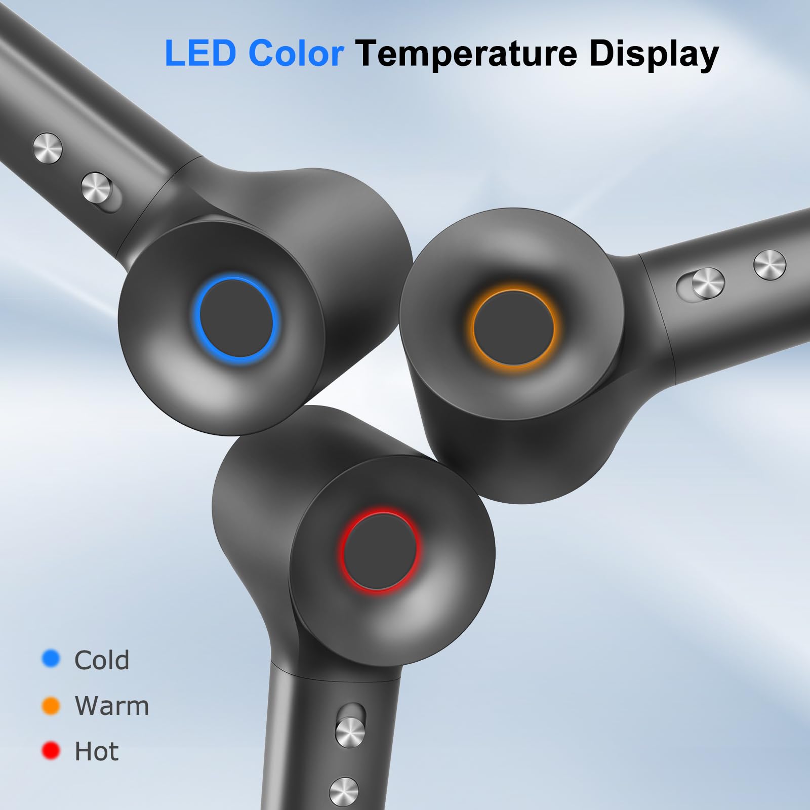 Smart Tri-color LED Ring Light Design:The three colors displayed on the circular LED ring correspond to the temperature settings of the hairdryer. Red means 78 degrees (hot air), yellow means 49 degrees (warm air), blue means cold air. Press and hold the button for two seconds to activate the intelligent circulation mode, which alternates hot and cold air every few seconds to prevent extreme heat from damaging your hair.