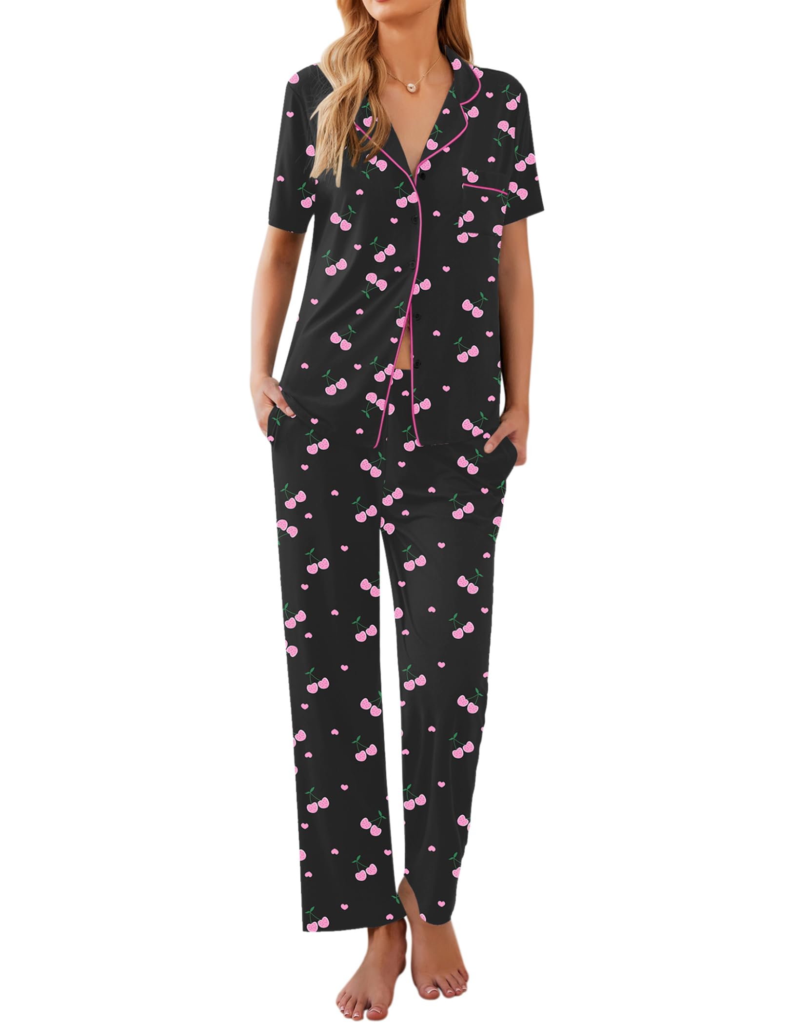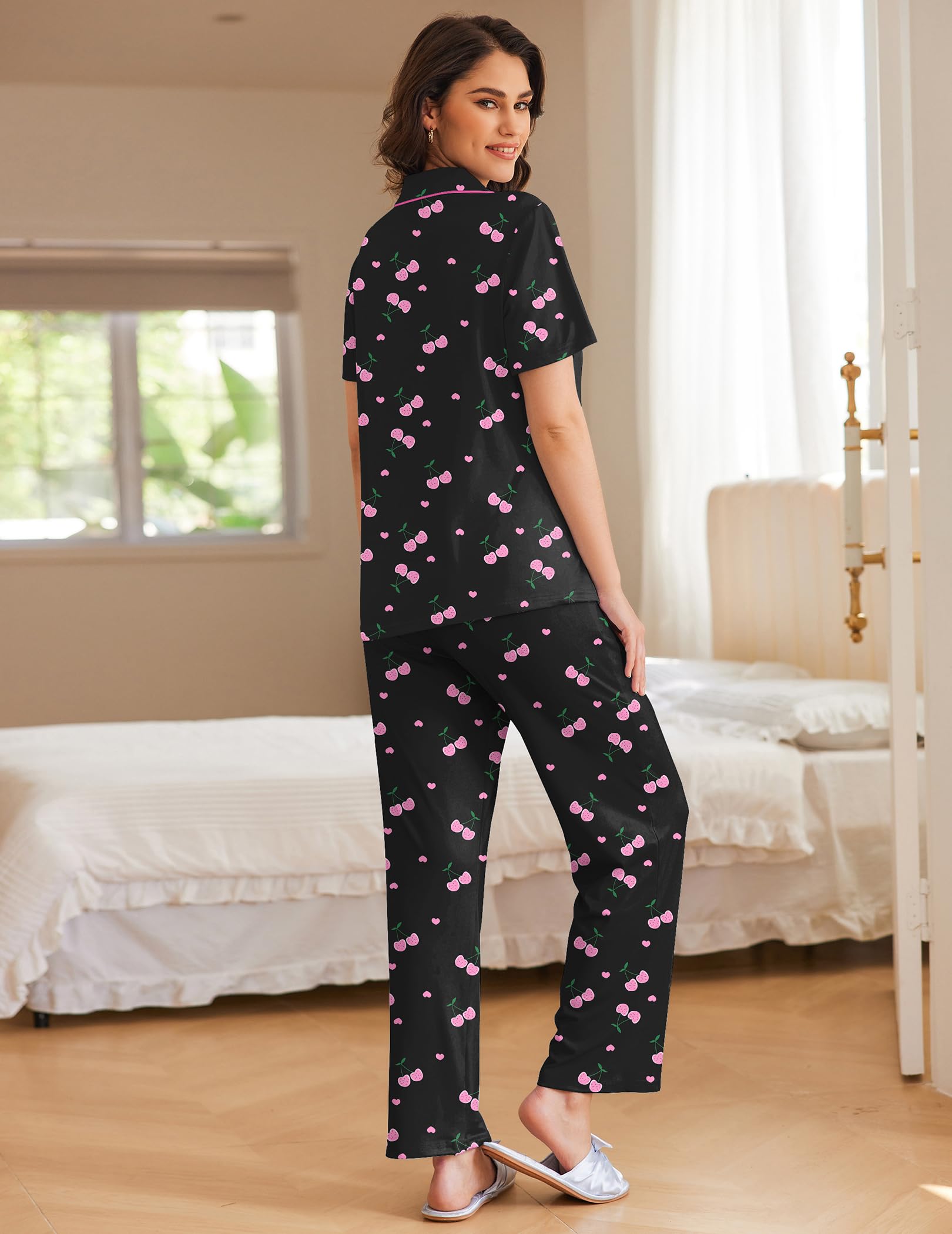【Button Down Top】Ekouaer 2 piece pajama set, short Sleeve top, botton down closure, classic notch v neck, lets you wear it open or closed easily , allowing you greater freedom of movement