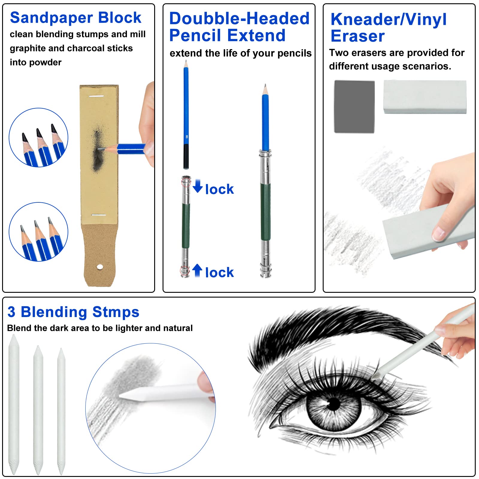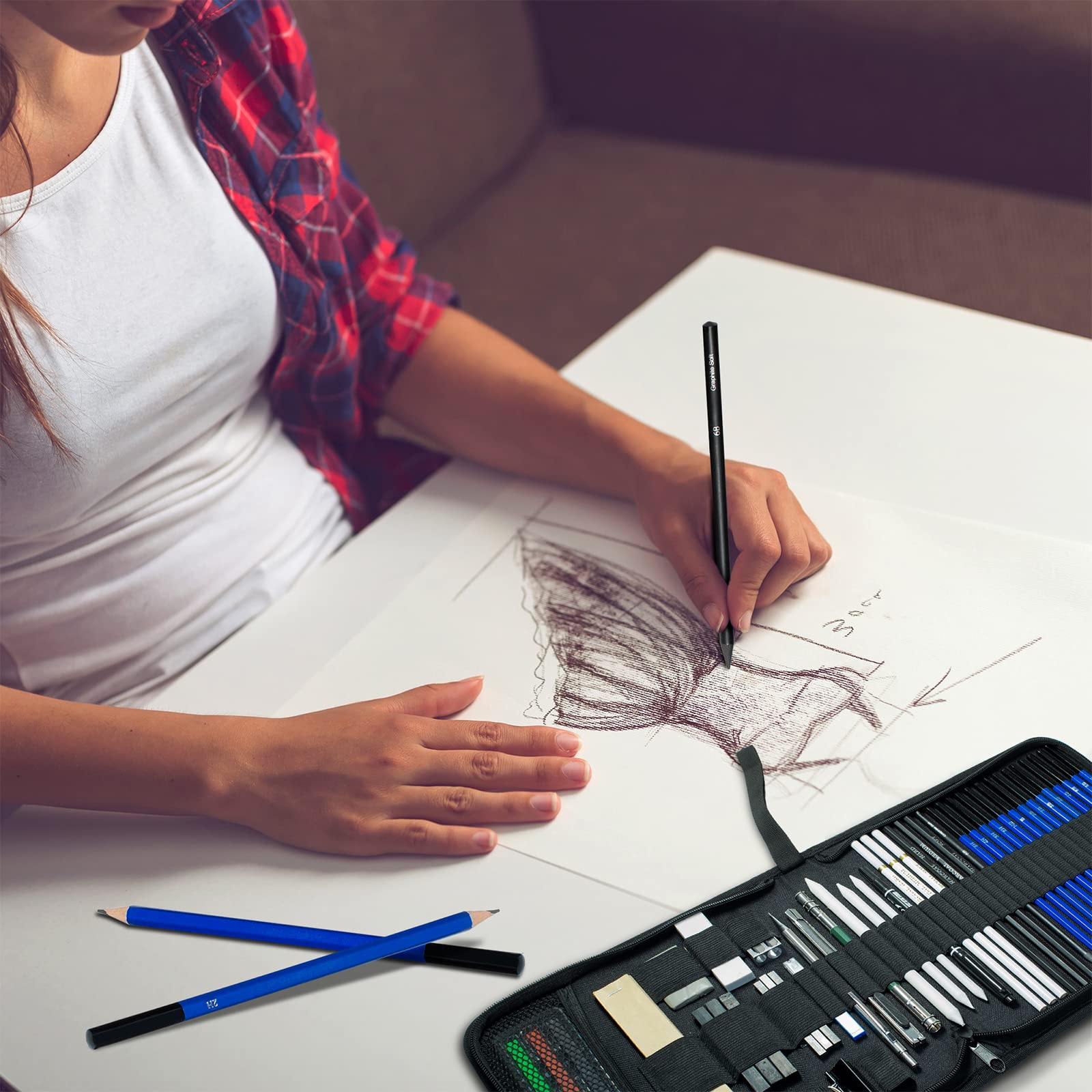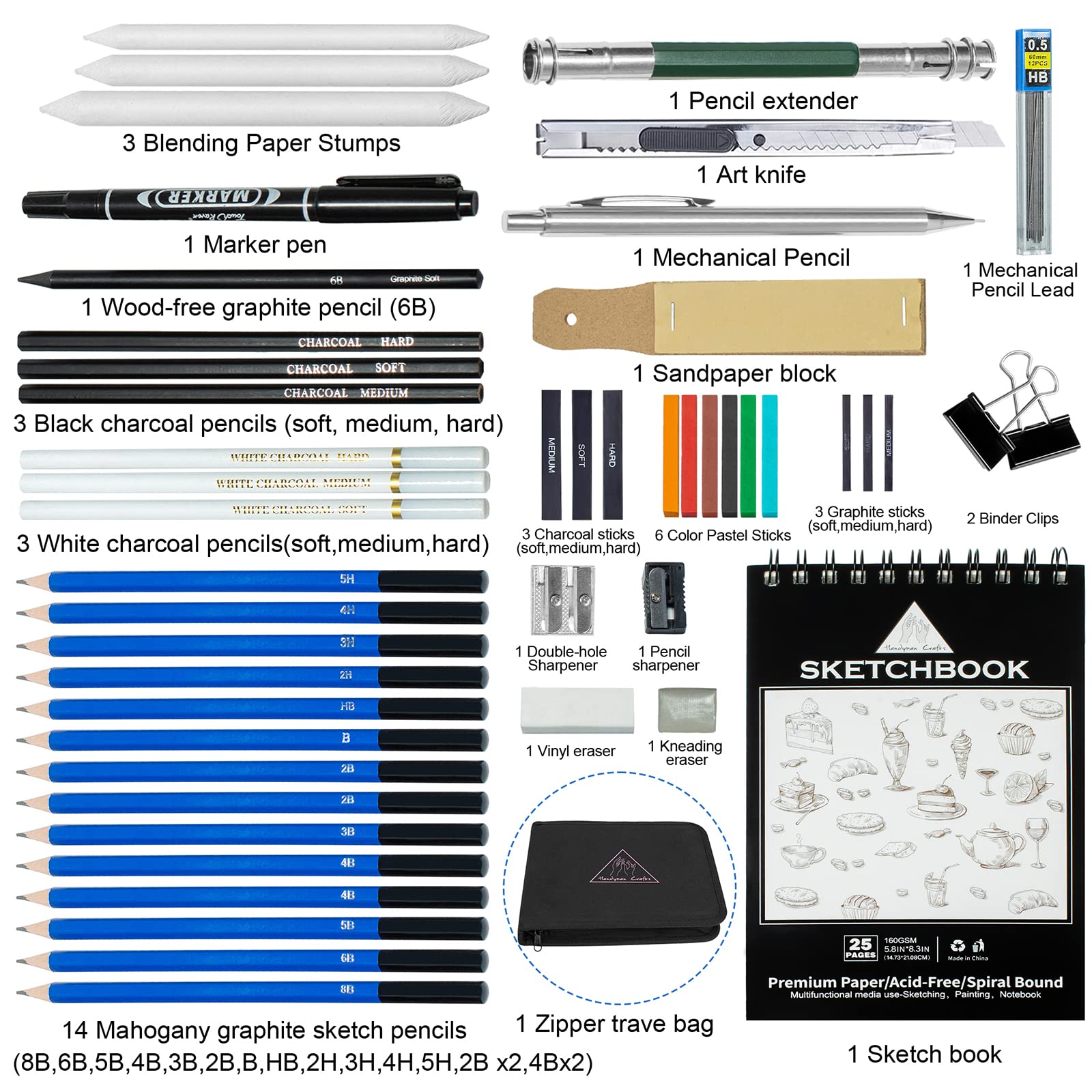 【Full Drawing Pencil Set】14 graphite pencil sets (8B, 6B, 5B, 4B*2, 3B, 2B*2, B, HB, 2H, 3H, 4H, 5H); A5 Sketch book (25 pages); 1 wood-free graphite pencil (6B); 3 black charcoal pencils 3 white charcoal pencils; 1 marker; 3 charcoal sticks; 3 graphite rods; 3 mixed paper piles; 6 color crayons; 1 kneading eraser; 1 vinyl eraser; 1 sandpaper block; 1 pencil extender; 1 double-ended and 1 single-grip pencil sharpener; 2 clips; 1 art knife; 1 mechanical pencil and lead; 1 zipper travel bag case case