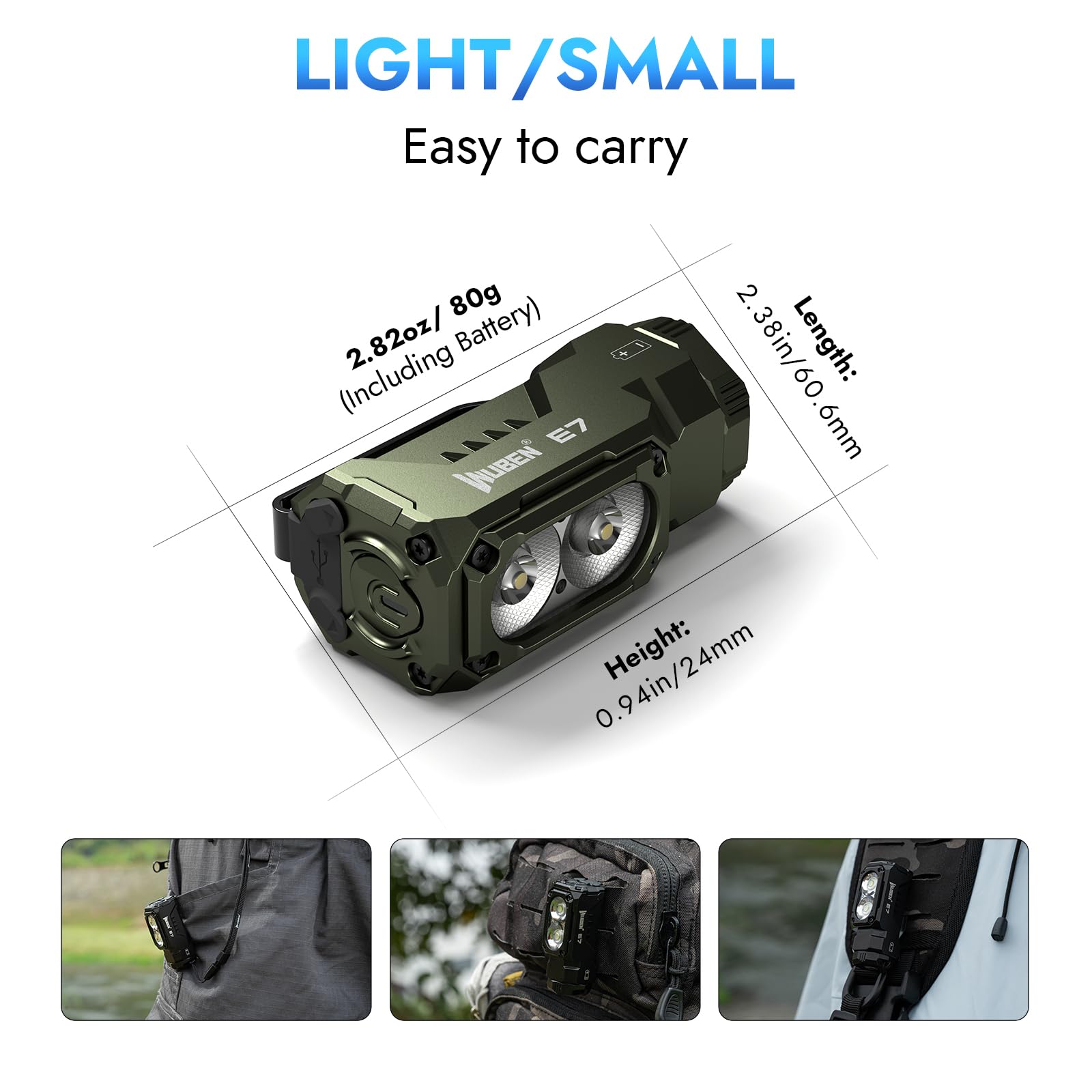 MULTI-FUNCTION EDC FLASHLIGHT: WUBEN E7 flashlight is an EDC flashlight with a strong magnet on the bottom to firmly hold iron objects, also has a hugging clip on the back to easily attach it to jacket pockets, backpacks, gears, waistbands; you can also put it into the headlamp clip (not included) to use it as a headlamp; you can plug in a Typ-c cable to control the use of the flashlight through the gesture remote sensor (not included), it's easy to carry and simple to use;