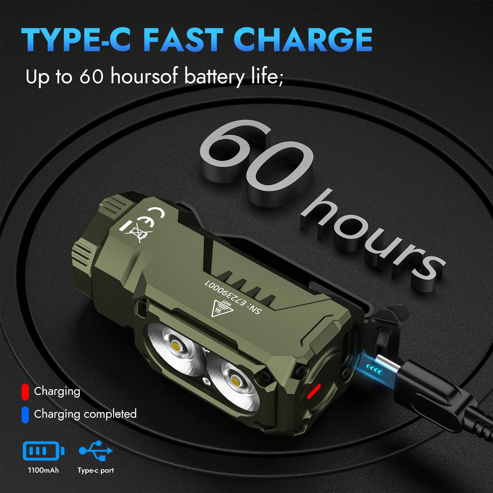 IP68 WATERPROOF & REECHARGEABLE:The overall body of the flashlight has a true waterproof design inside, made of aircraft-grade aluminum alloy with micro-arc oxidation process. If you forget to cover our charging hole for something and accidentally drop it into water, it will not damage the inside of our flashlight. Equipped with 1100 mAh rechargeable battery, it only takes 1.5 hours to fully charge. Red and blue battery indicator light let you know the battery level at any time.