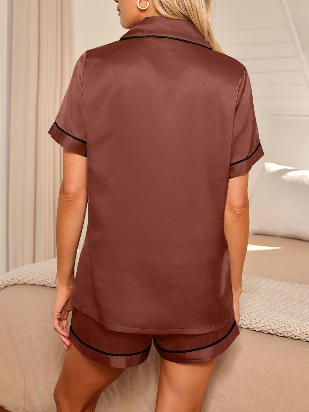 Pajama Top: Short sleeve sleepwear with notch collar,button front pajamas shirt and one chest pocket design.Lightweight and Skin-friendly silk pajamas for women.Great for sleeping,casual wear or lounging around the house or yard all day