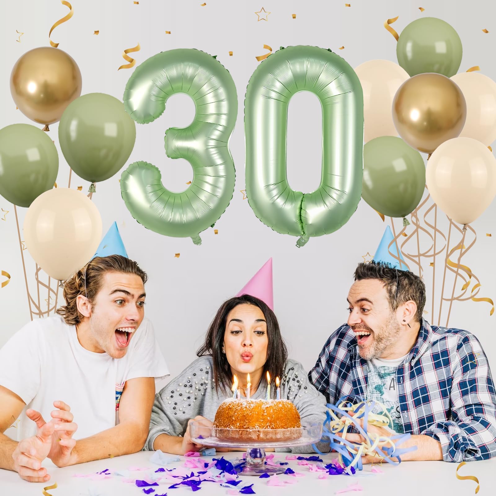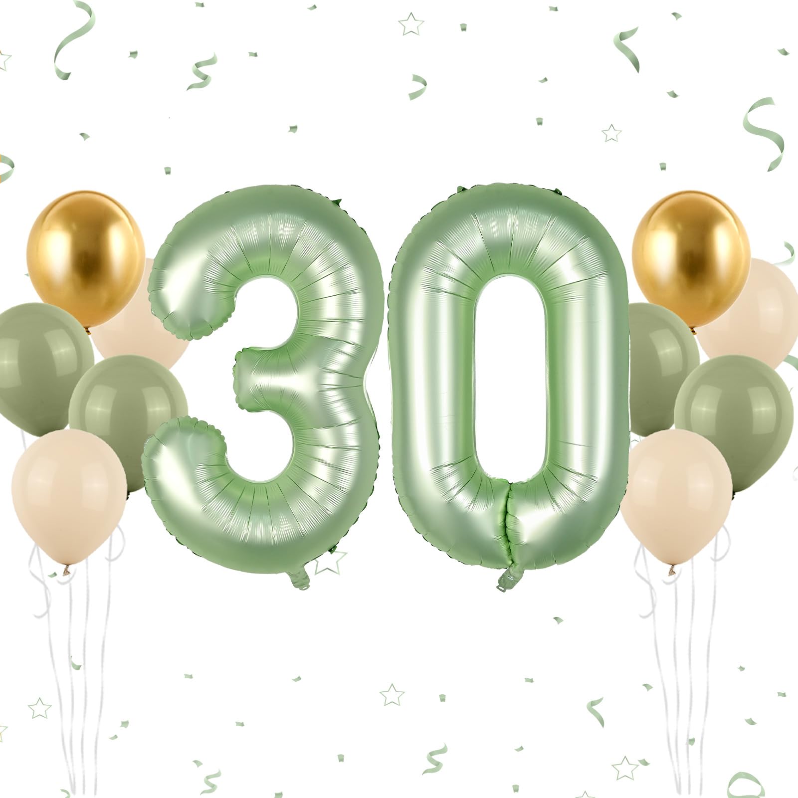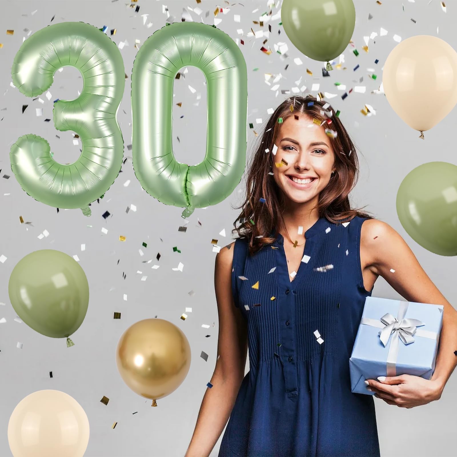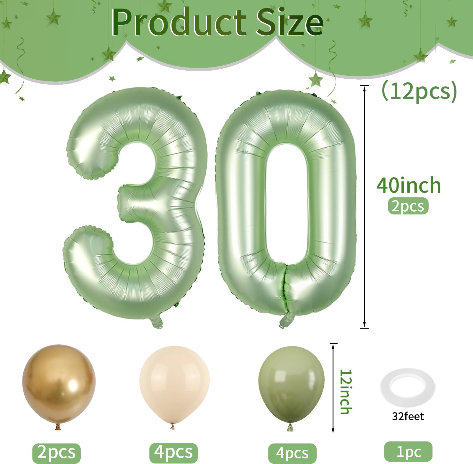 Product Contents: This 30th birthday balloons set includes 2 pcs 40 inch sage green number balloons, 4 pcs 12 inch sand white balloons, 4 pcs 12 inch sage green balloons, 2 pcs 12 inch metallic gold balloons, and 1 pc 32 feet of white ribbon