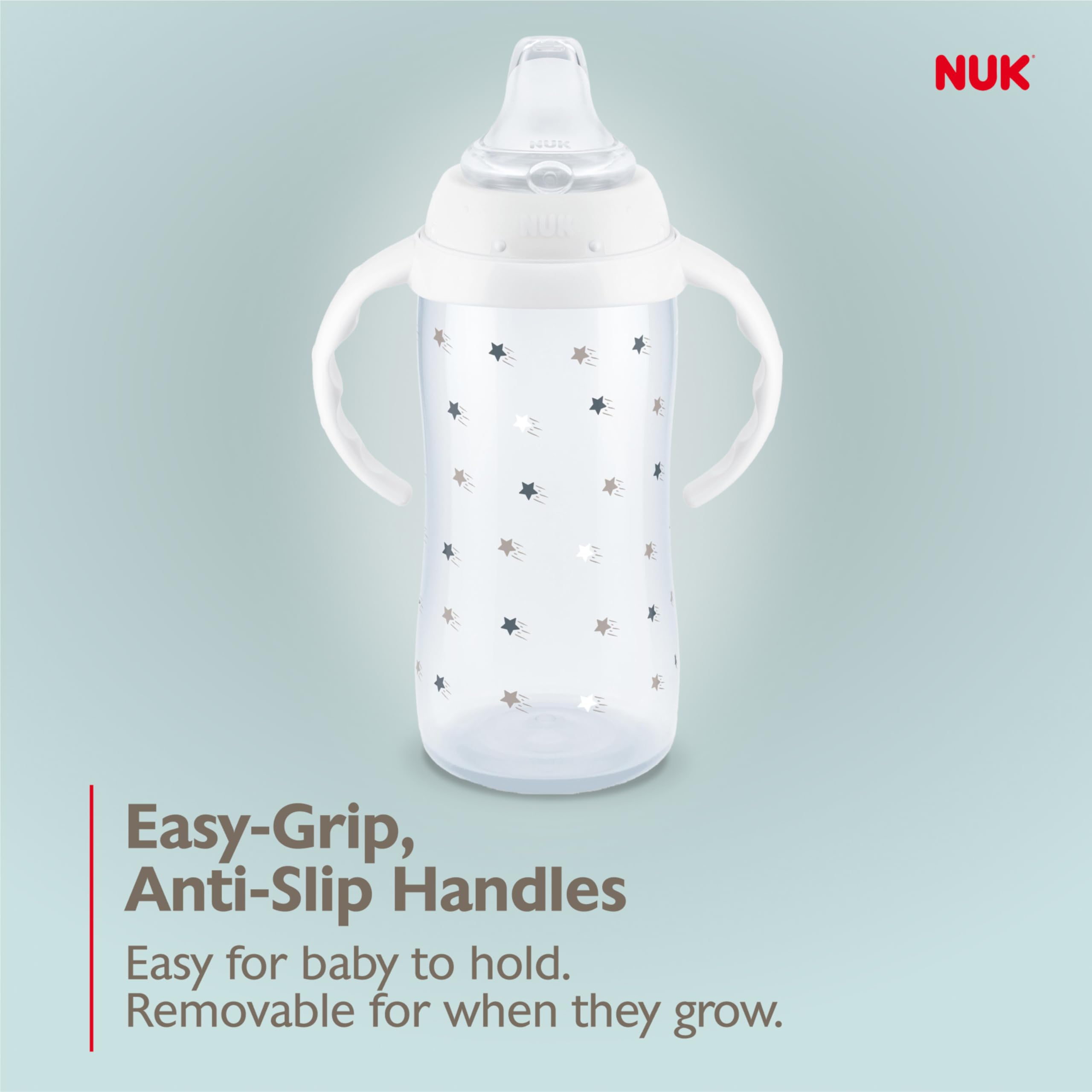The NUK Learner Cup easily promotes baby’s transition from breast or bottle to sippy cup. This learner cup features a spill-proof soft spout that is gentle on teeth and gums, and it includes an air vent that helps reduce swallowed air. The cup also comes with easy-to-grip, removable handles that your growing child will love. NUK Learner Cups are BPA-free and dishwasher-safe. Our 10-oz. learner cups are recommended for ages 8 months and older.