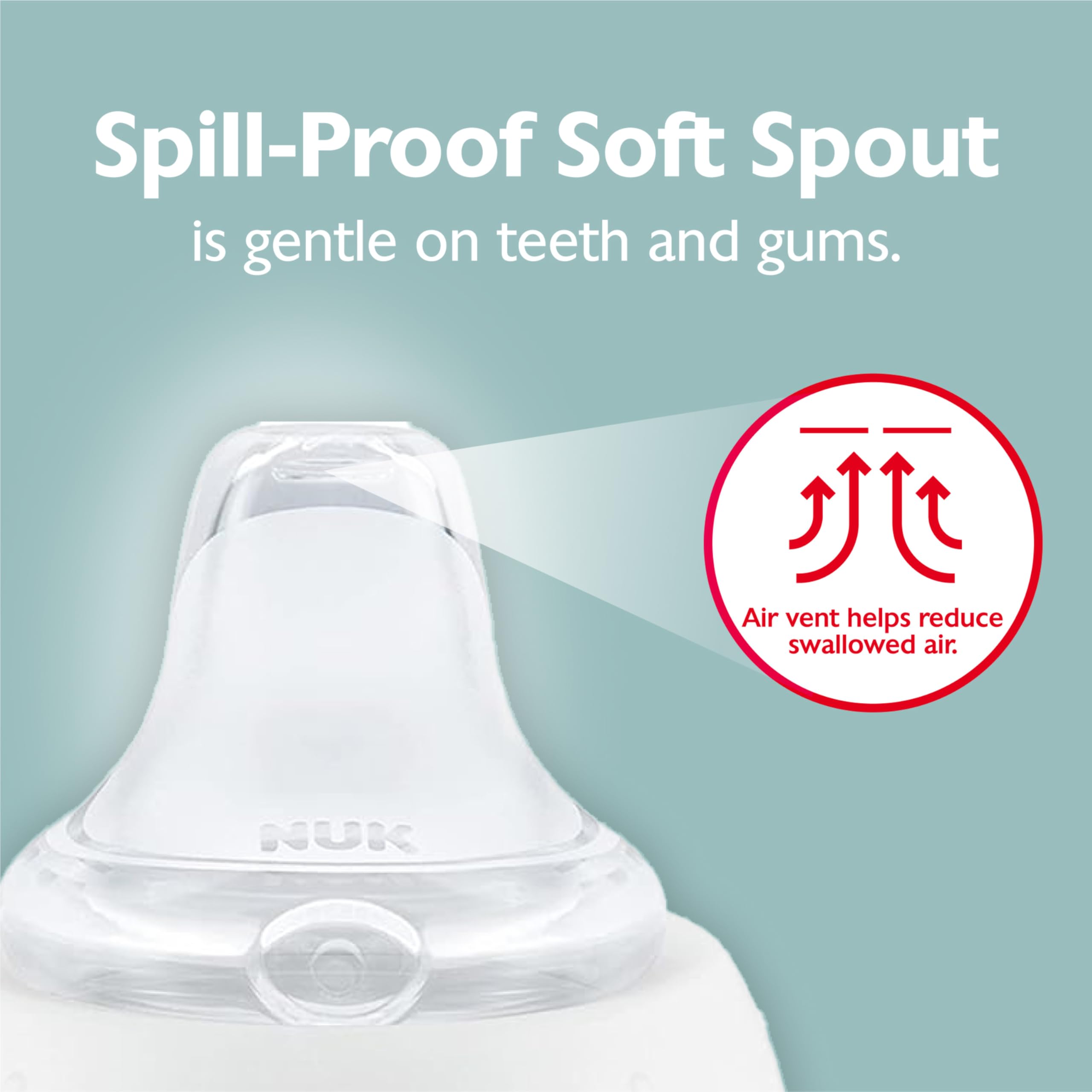 Spill-proof soft spout is designed to be gentle on gums while teaching baby to drink from a spout; liquids flow easily when sipped