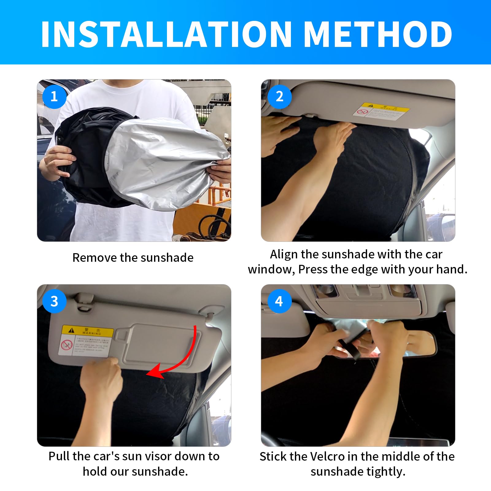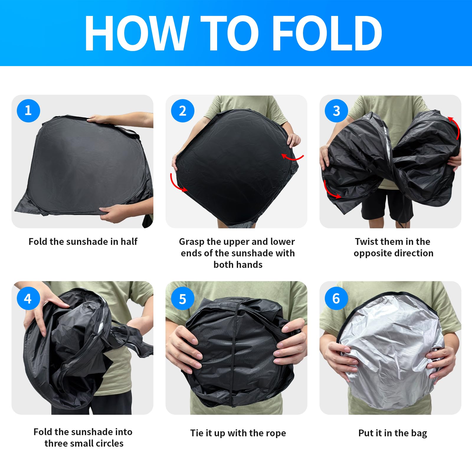 【Easy Installation & Storage】 Install and fold our front window sunshade cover in seconds, without the need for suction cups or adhesives. Its elastic memory steel wire ensures it never deforms, making it easy to unfold for use and effortless to store in the bag when not in use. Enjoy hassle-free protection for your vehicle's interior.