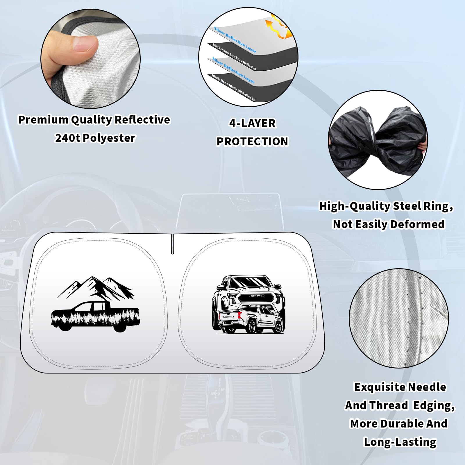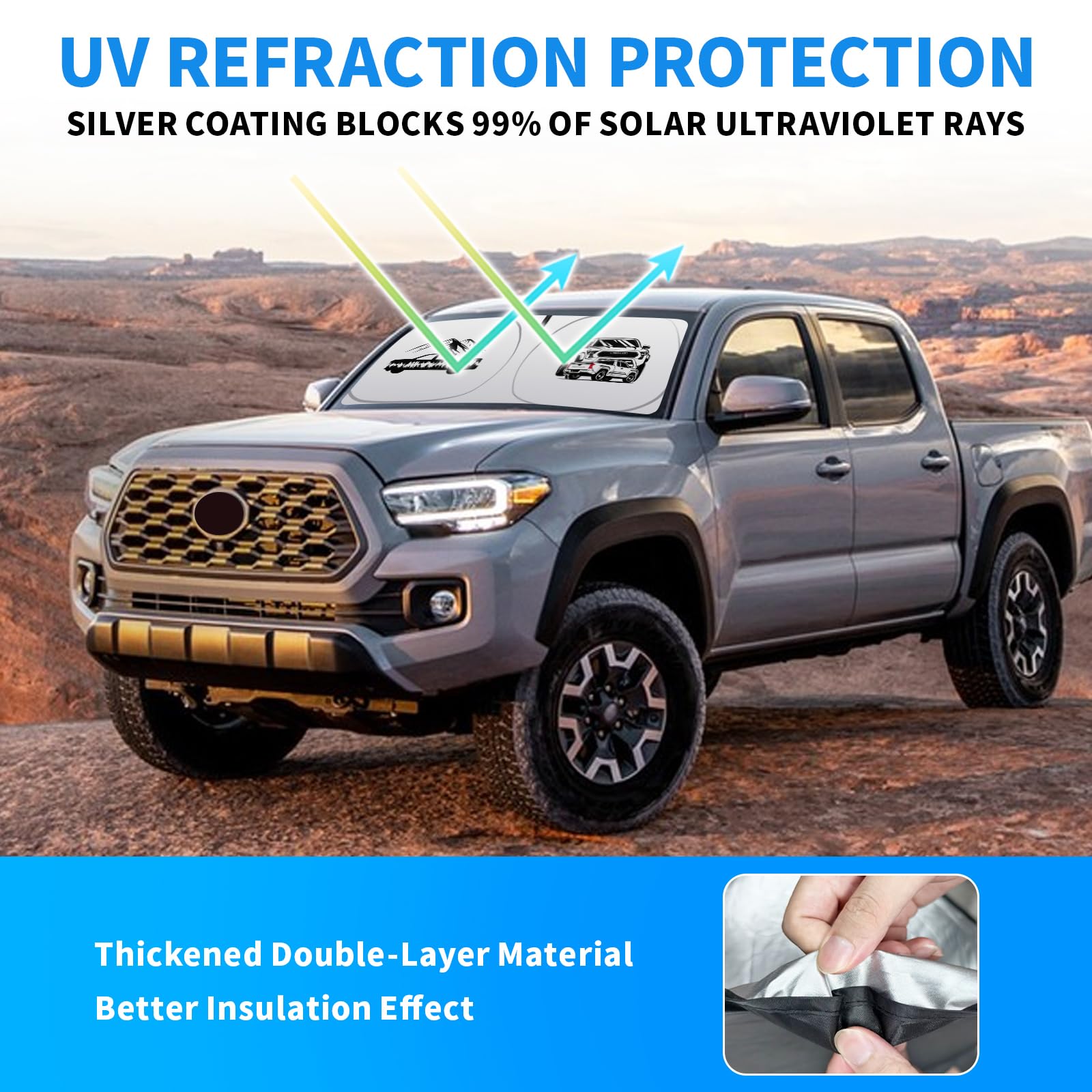 【Vehicle Specific】Our windshield shade cover custom fit for Toyota Tacoma N400 2024–present. The precise fit design ensures our sunshade completely covers the front windshield. Protect your car from sun rays & heat damage and keep the car interior cool.